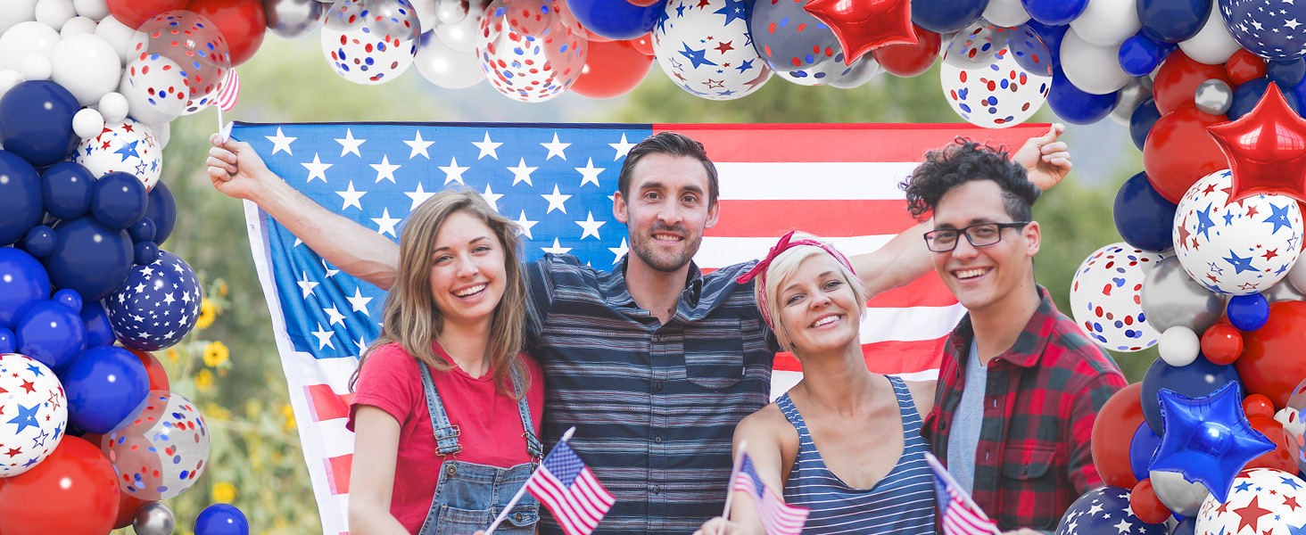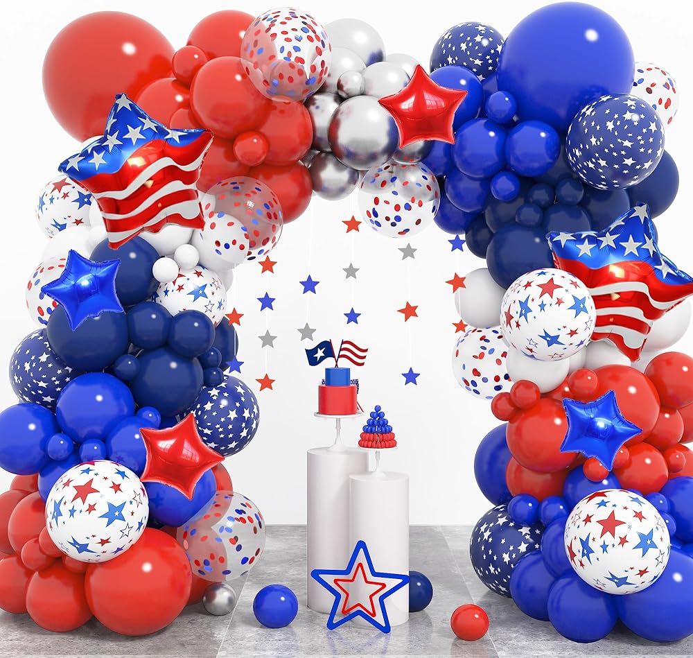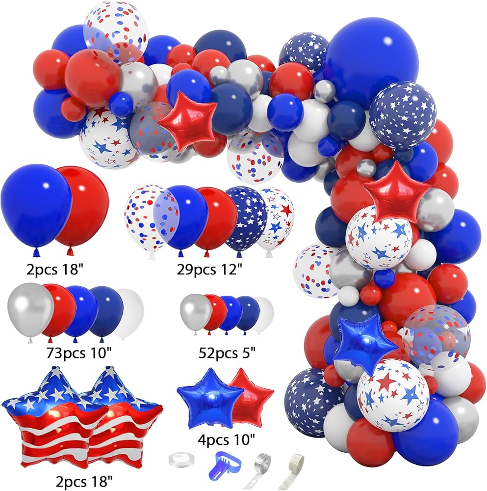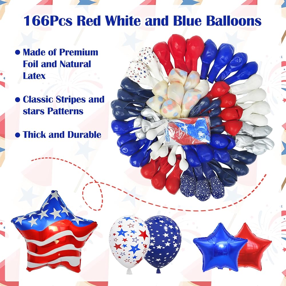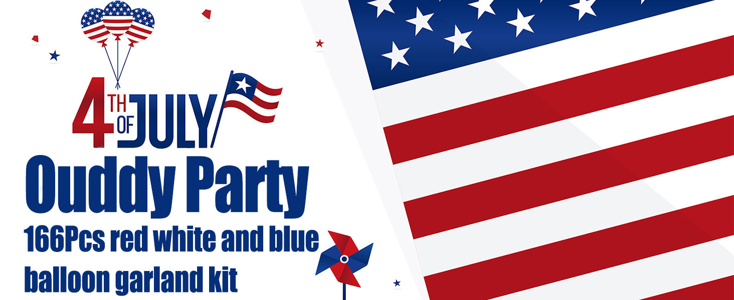 • مجموعة ديكورات الحفلات اللائقة: بالونات الرابع من يوليو الغنية والجميلة لامعة وتحظى بشعبية للديكورات الحمراء والبيضاء والزرقاء وديكورات الرابع من يوليو، والتي ستصبح ناجحة لديكورات عيد الاستقلال أو غيرها من الحفلات ذات الطابع الوطني مع هذه البالونات الحمراء والبيضاء والزرقاء مجموعة القوس وستحقق تأثيرًا زخرفيًا ممتعًا مع الكثير من الإطراء.