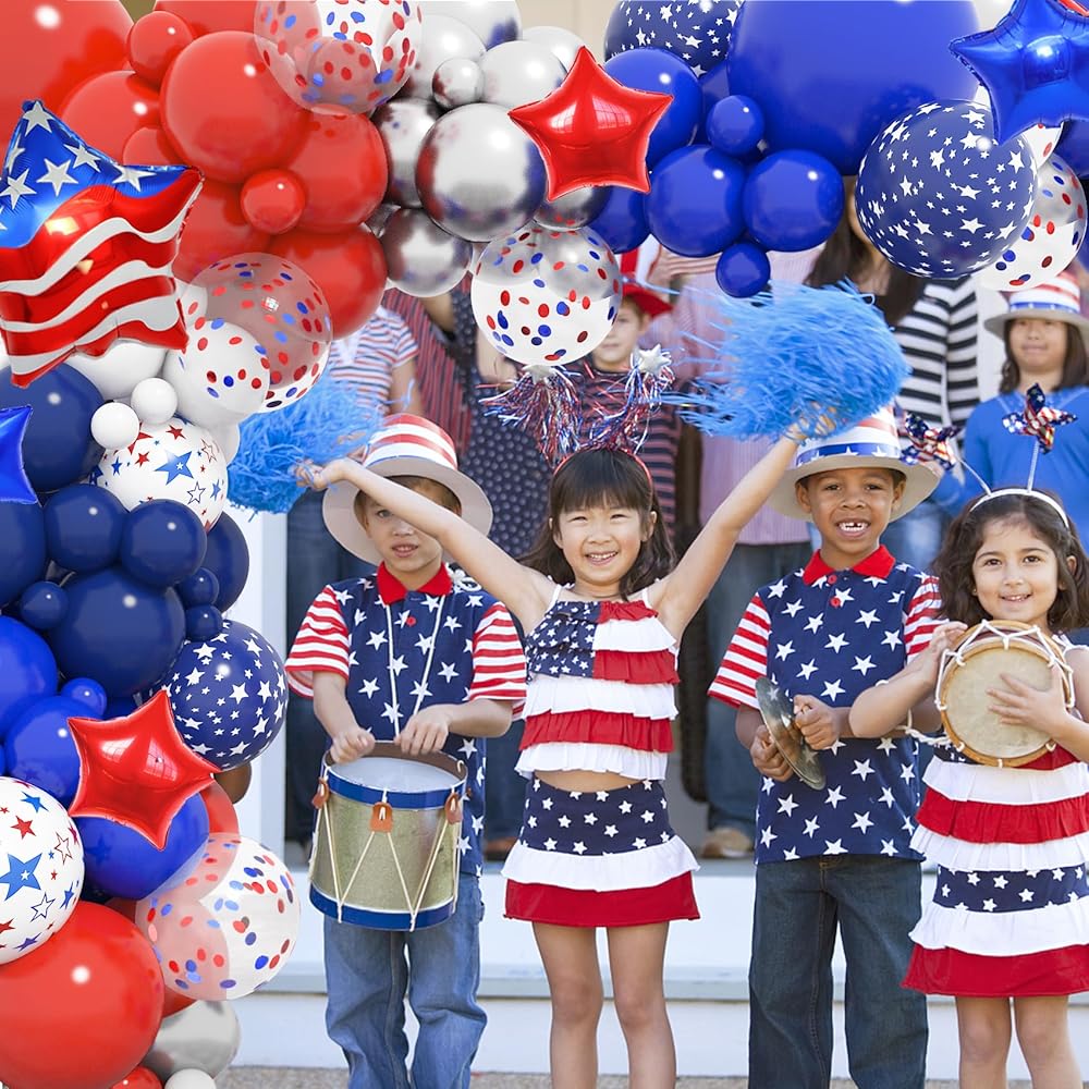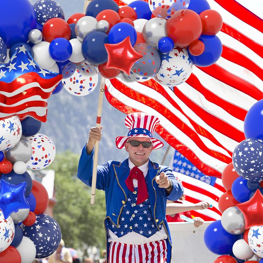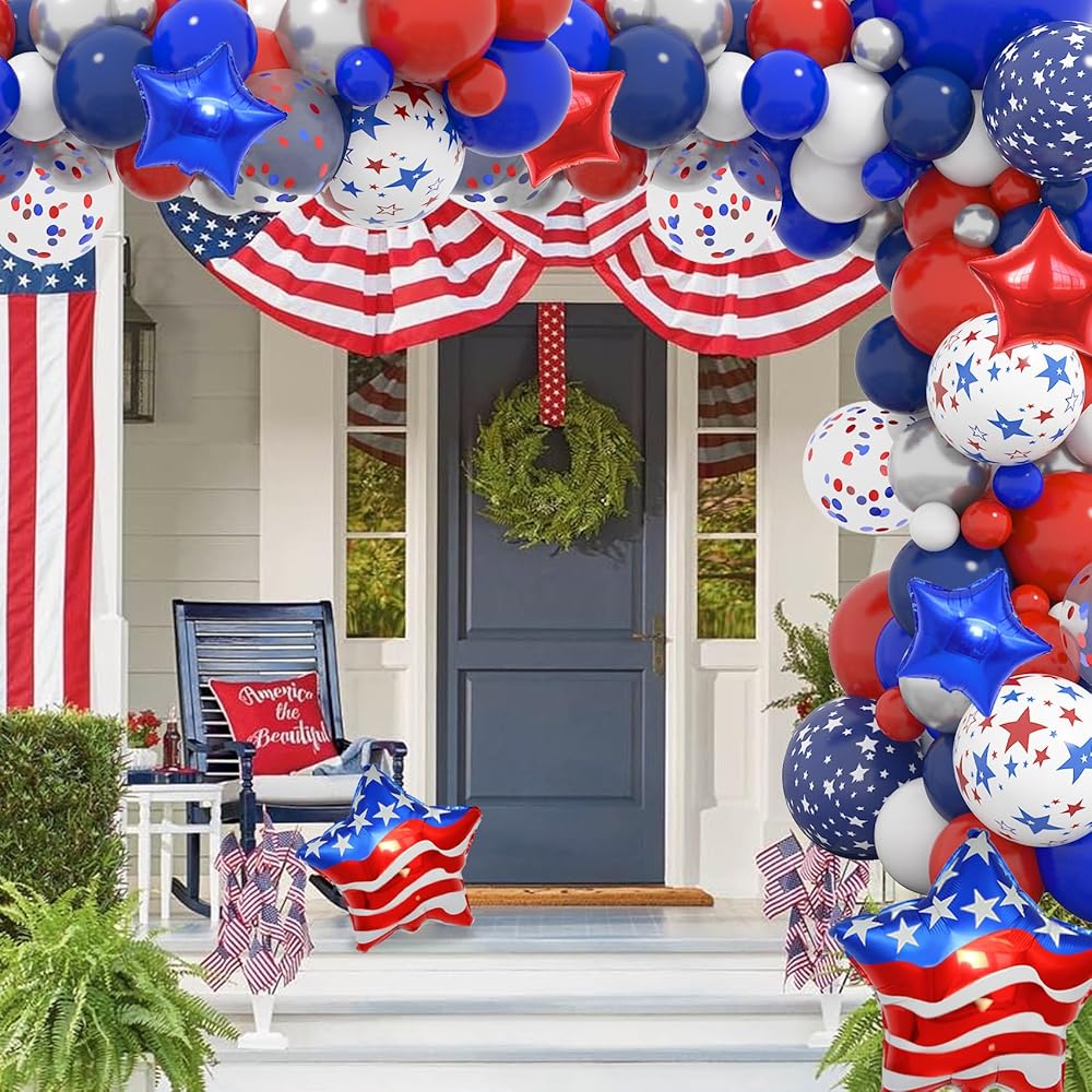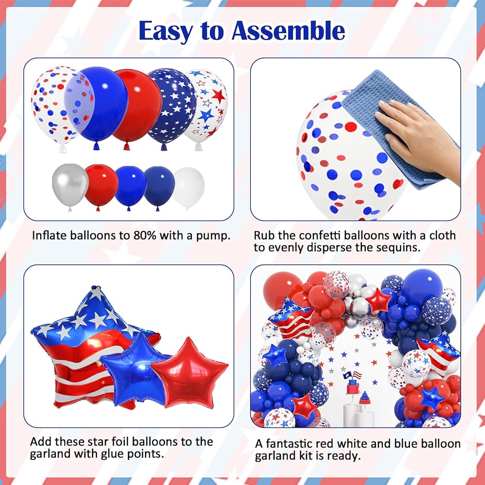 • مجموعة ديكورات الحفلات اللائقة: بالونات الرابع من يوليو الغنية والجميلة لامعة وتحظى بشعبية للديكورات الحمراء والبيضاء والزرقاء وديكورات الرابع من يوليو، والتي ستصبح ناجحة لديكورات عيد الاستقلال أو غيرها من الحفلات ذات الطابع الوطني مع هذه البالونات الحمراء والبيضاء والزرقاء مجموعة القوس وستحقق تأثيرًا زخرفيًا ممتعًا مع الكثير من الإطراء.