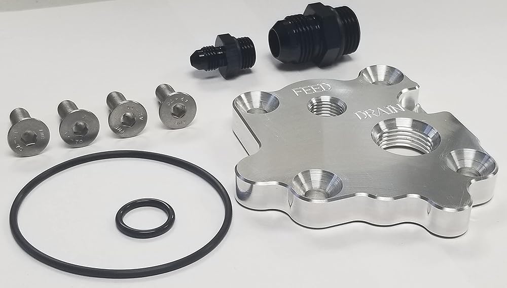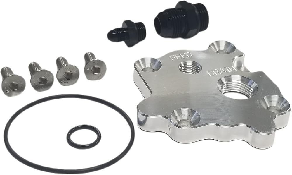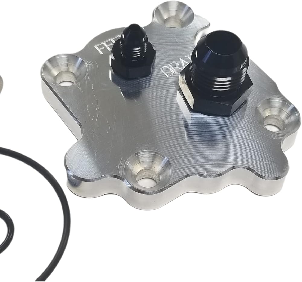 Z Whip LT Vacuum Pump Turbo Oil Feed Drain Plate. LT Oil Distribution Block Used to Supply and Return Oil to Single or Dual Turbos or Supercharger. This attaches to the Gen 5 Engine Block Where the factory Vacuum Pump Attaches. Plate has a -6 ORB Feed Port with a -6 ORB to -4AN Male Fitting and a -10 ORB Drain Port with a -10 ORB to -10AN Male Fitting. This utilizes the oil supply and return that is on the engine block for the OEM Vacuum Pumps. If the engine did not come with the vacuum pump, make sure the Allen plugs are removed and the mating surface is clean and smooth before installation. Comes with O-ring Seals, Fittings and SS Bolts as pictured. Compatible with ALL Chevrolet LT GEN 5 Series Engines 2014-up LT1 LT2 LT4 LT5 5.3L 6.2L L82 L83 L84 L86 L87 L8B Silverado Sierra Camaro Corvette CTSV. It is Recommended torque to 18FT-LBs.