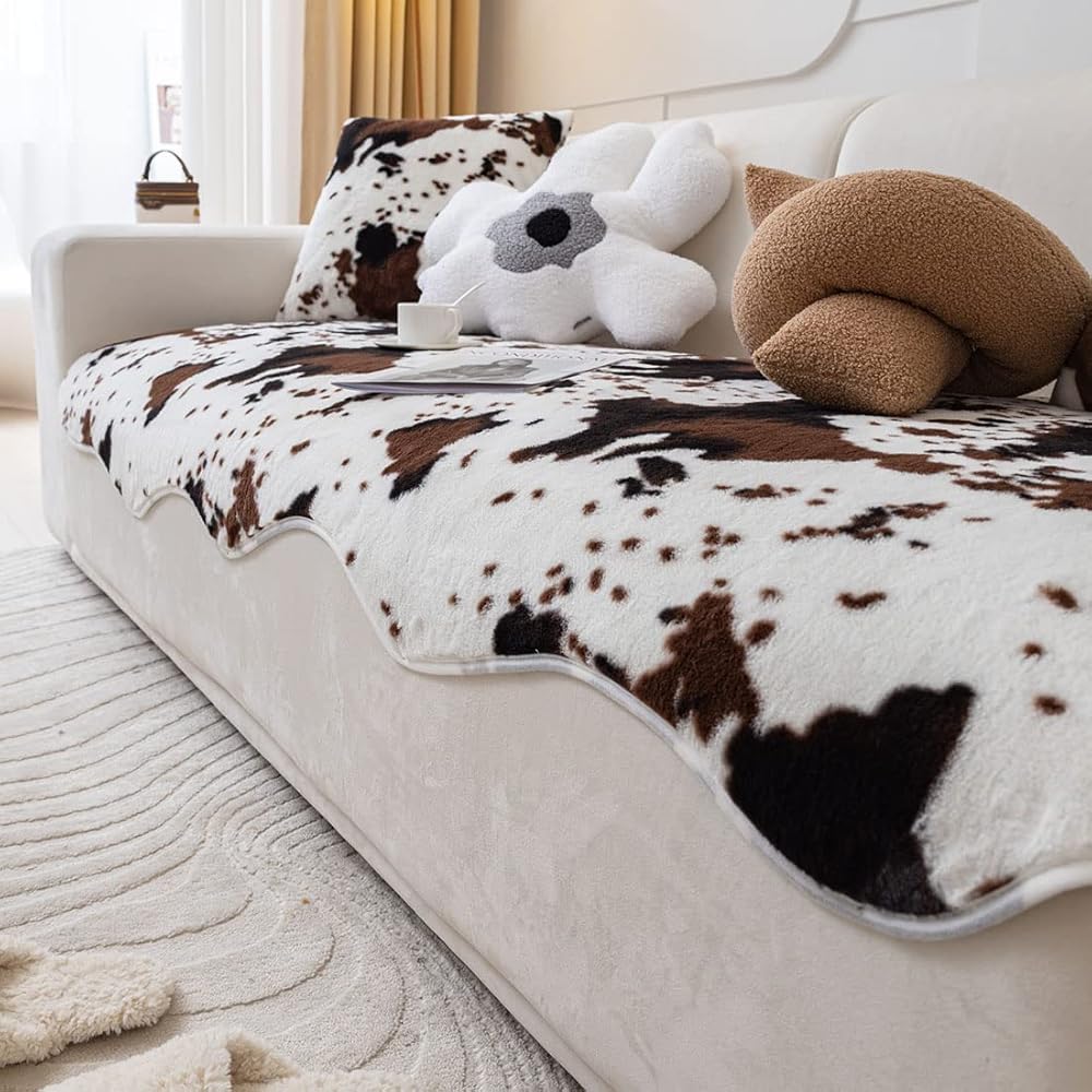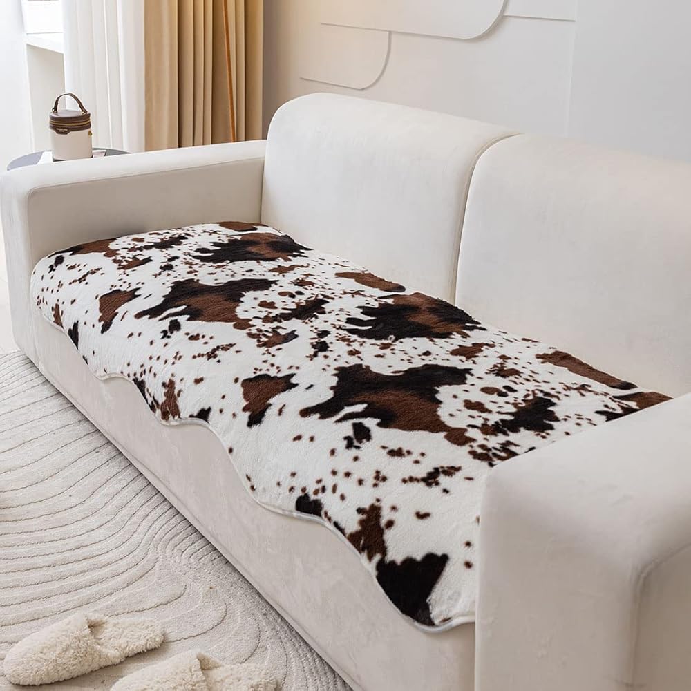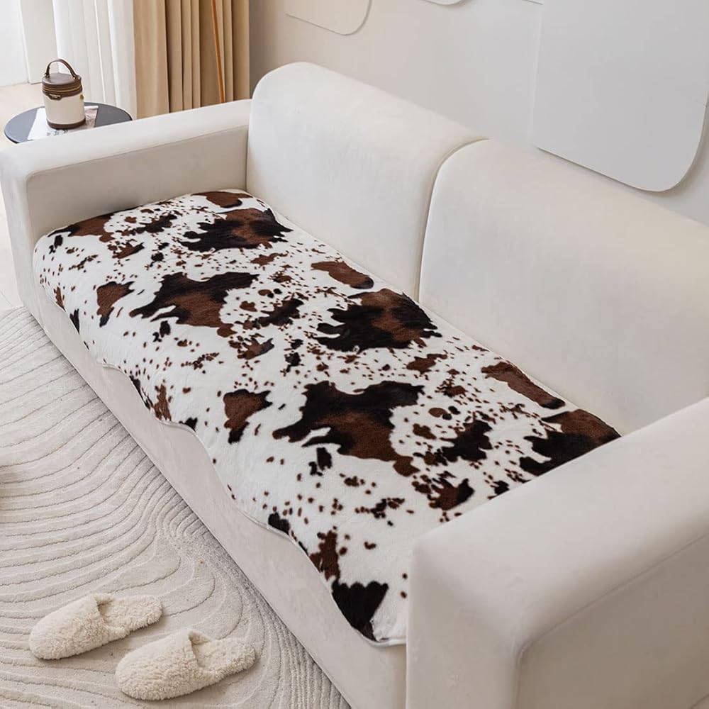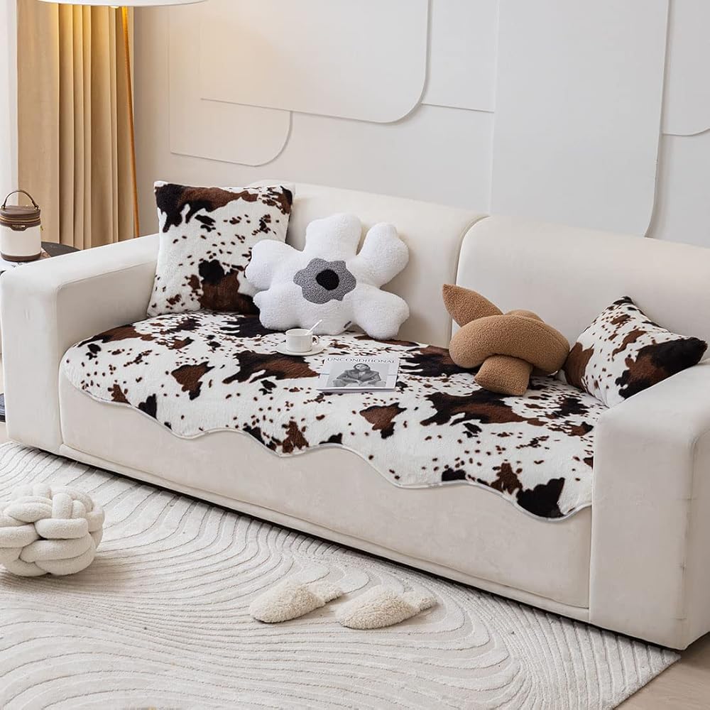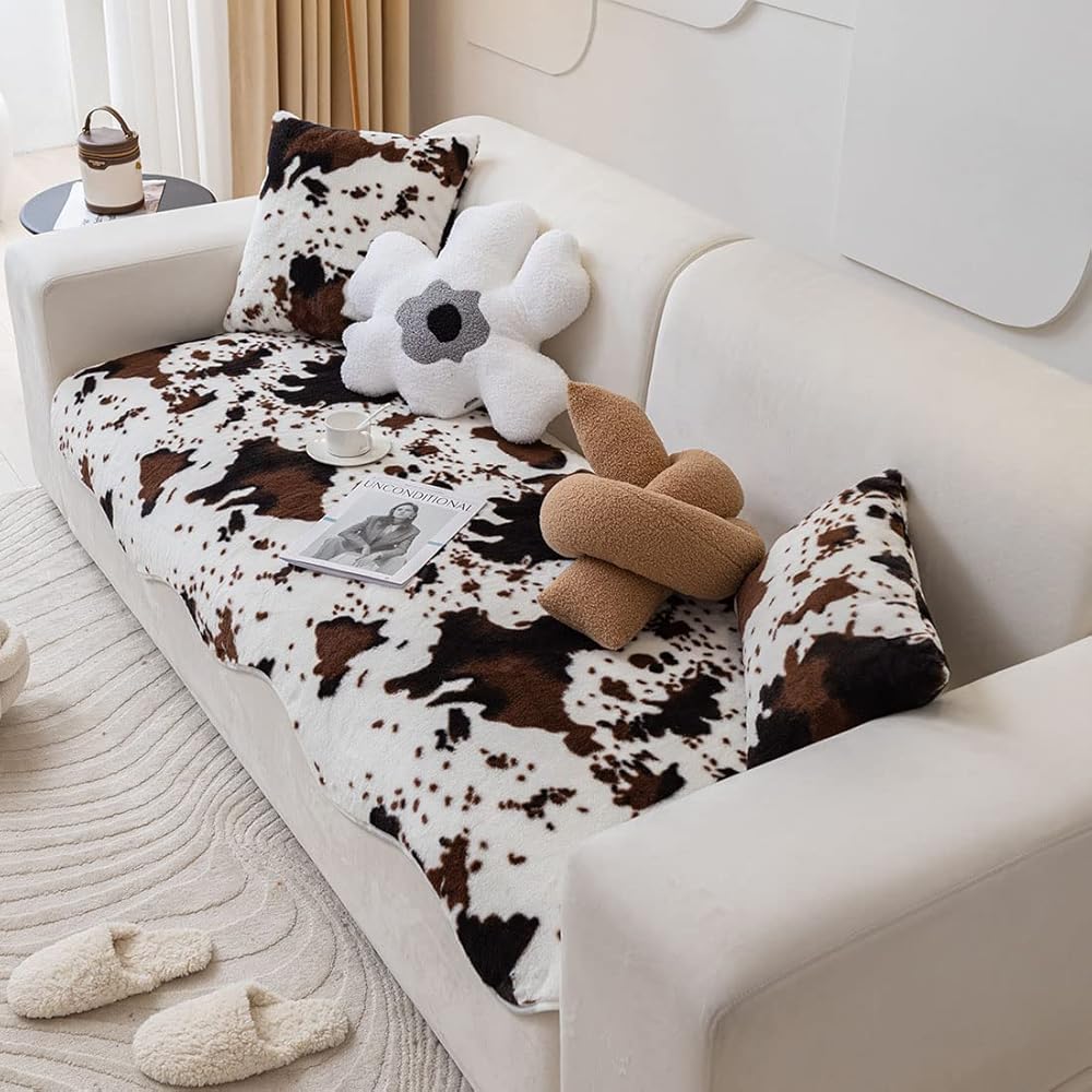 المواد: غطاء الأريكة المطبوع على شكل بقرة مصنوع من فرو الأرنب الصناعي عالي الجودة، وهو مريح وناعم الملمس.