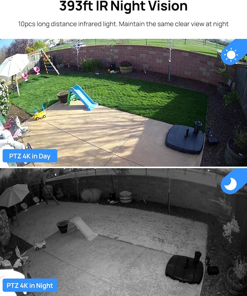 【رؤية ليلية طويلة جدًا PoE و393 قدمًا】 تدعم كاميرا الأمان PTZ بدقة 8 ميجابكسل PoE (الطاقة عبر الإيثرنت)، وكابل شبكة واحد فقط لنقل الطاقة والبيانات، وسيتم تشغيل حاقن PoE/المفتاح/NVR والكاميرا، مما يلغي تحتاج إلى تركيب كابل طاقة منفصل، مما يبسط عملية التثبيت ويقلل من تكاليف الكابلات. يمكن لإضاءة 10 IR LED المدمجة التقاط صور واضحة في الإضاءة المنخفضة أو الظلام الدامس، ورؤية ليلية طويلة جدًا تصل إلى 393 قدمًا.