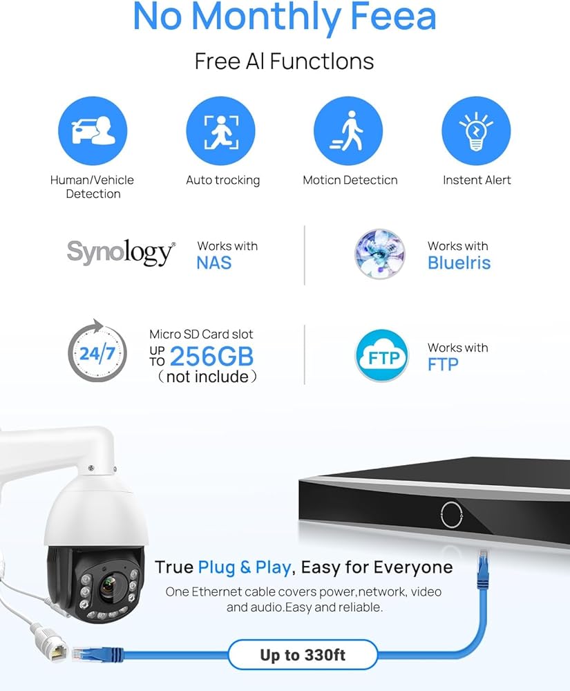【بروتوكول ON-VIF】تدعم كاميرا PoE PTZ بدقة 8 ميجابكسل بروتوكول ON-VIF المتوافق مع NVRs الأخرى من طرف ثالث، DVR غير مدعوم. تتوافق كاميرا PTZ مع معظم برامج مراقبة الأمان، مثل Blue Iris وiSpy وVLC وما إلى ذلك (تدعم RTSP). يسمح الضغط المزدوج H.265/H.264 بأقصى قدر من التشفير باستخدام أحدث التقنيات بالإضافة إلى التوافق مع الأنظمة الأساسية القديمة.