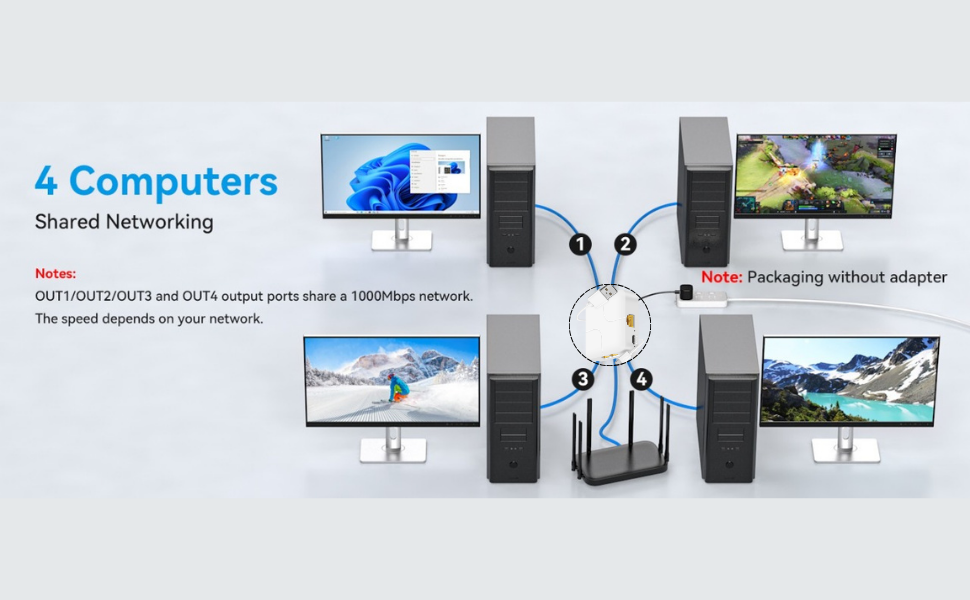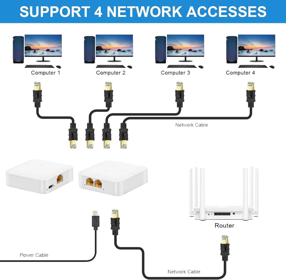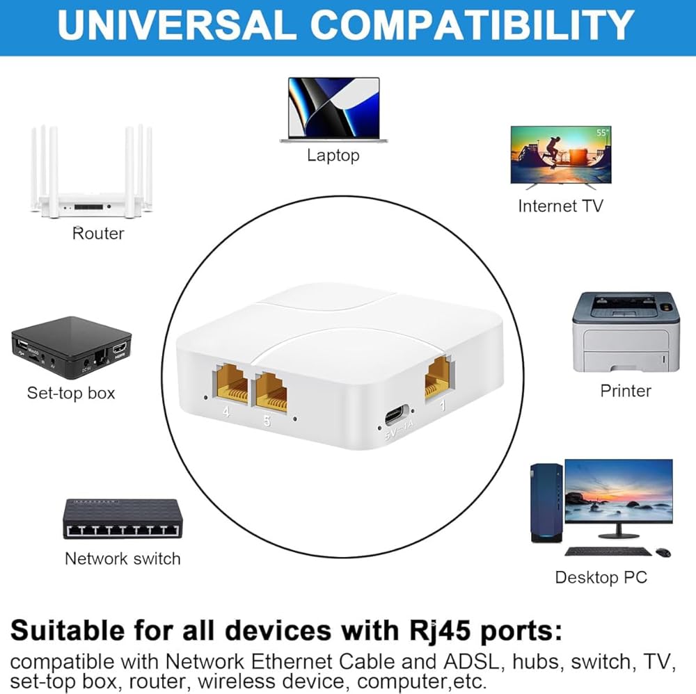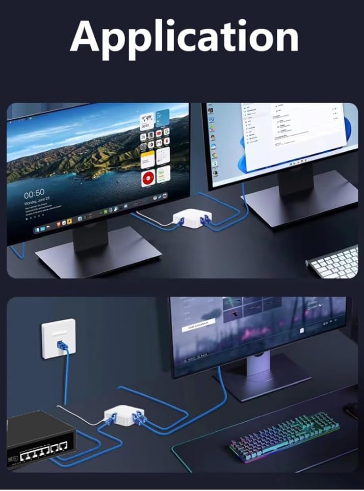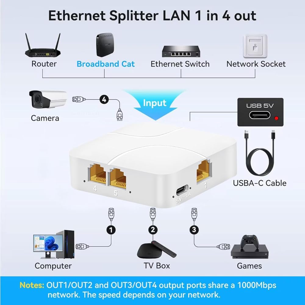 تصميم 4 منافذ: يتميز بـ 4 منافذ RJ45، يعمل المقسم كمفتاح شبكة صغير الحجم لتوسيع اتصال الشبكة السلكية الخاصة بك لأجهزة متعددة في مكان واحد.