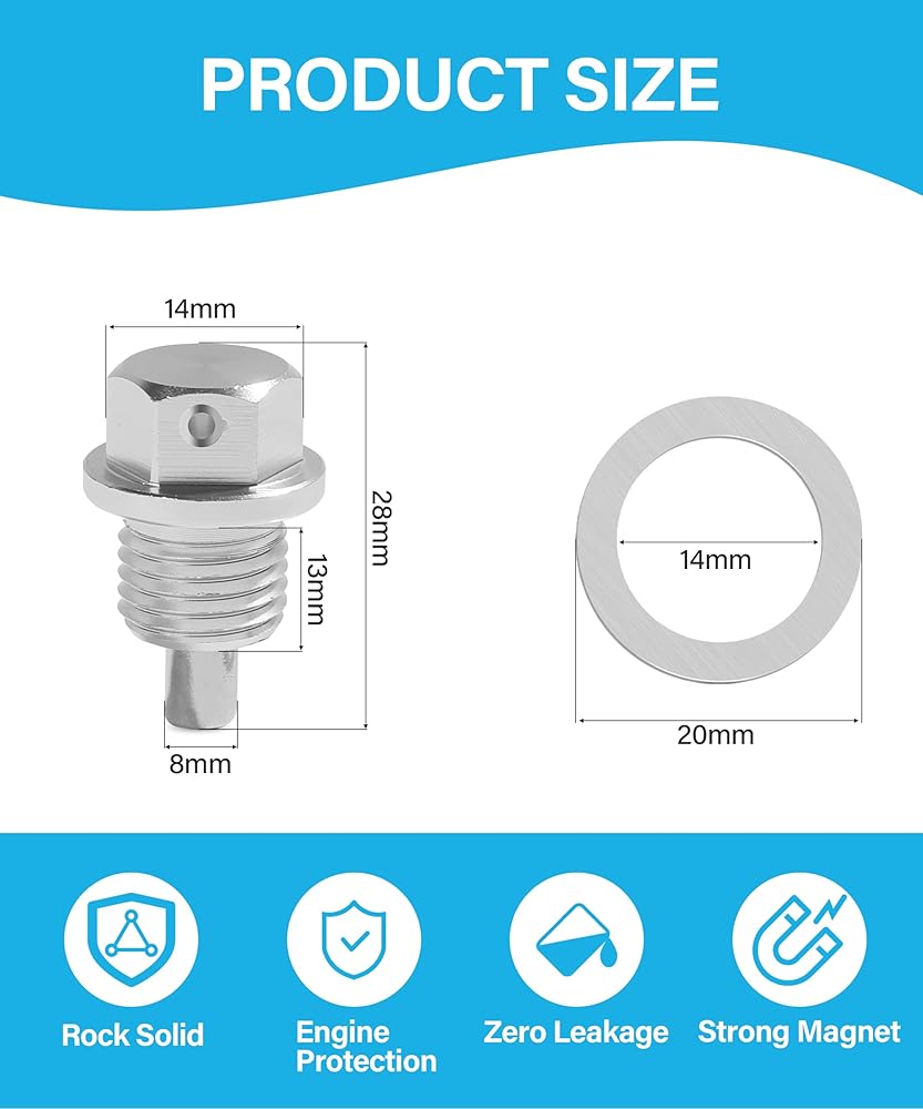 [Easy to Install] The magnetic oil drain nut is deeply threaded, which makes the oil drain plug easier to install and less prone to misalignment when screwing in the oil drain screw. Simply screw on the oil plug and copper washer until the plug is felt to tighten, and the oil pan drain screw will firmly grasp the tank port, ensuring that the drain plug will not fall off or cause oil leakage during use.
