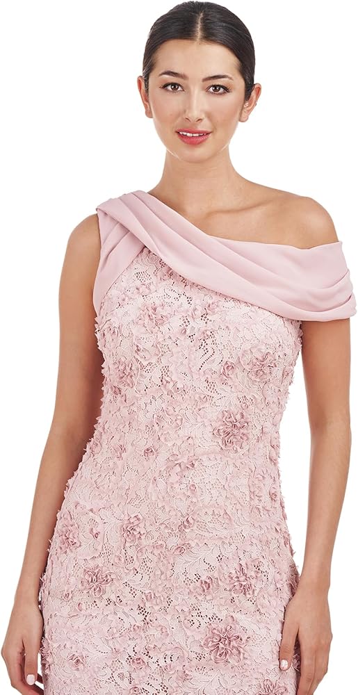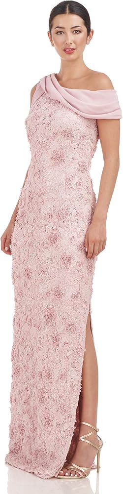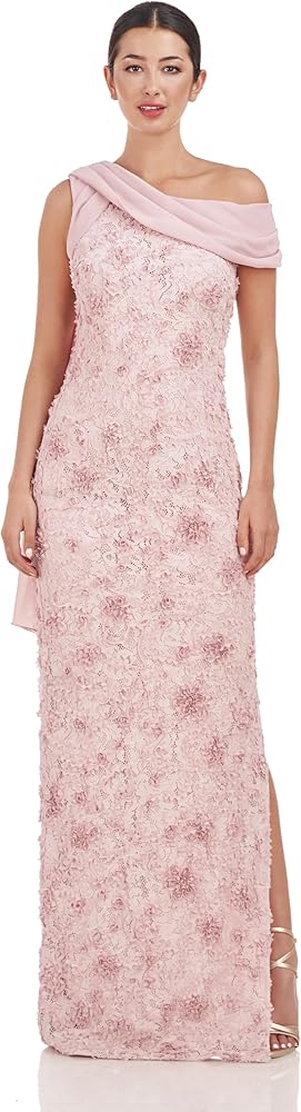 - Lace with floral chiffon soutache column gown with asymmetrical chiffon shoulder drape with faux back scarf detail and side skirt slit.