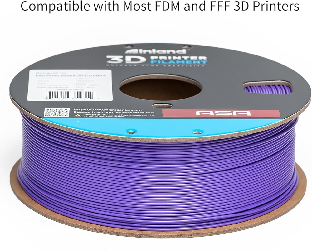 Micro Center Inland ASA 3D Printer Filament Specs 1.75mm +/- 0.03mm) Diameter ASA Acrylonitrile Styrene Acrylate) 220°C - 260°C Print Temperature 110°C Plate Temperature Designed with the highest quality and compatibility in mind, Inland ABS Filament undergoes numerous testing procedures to ensure that you spend less time troubleshooting and more time creating! Strength, flexibility, and higher temperature resistance are some of the print traits of ABS-based filaments.