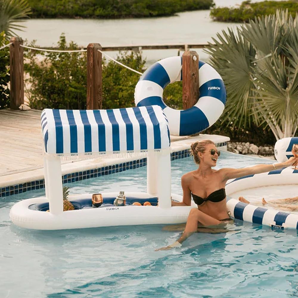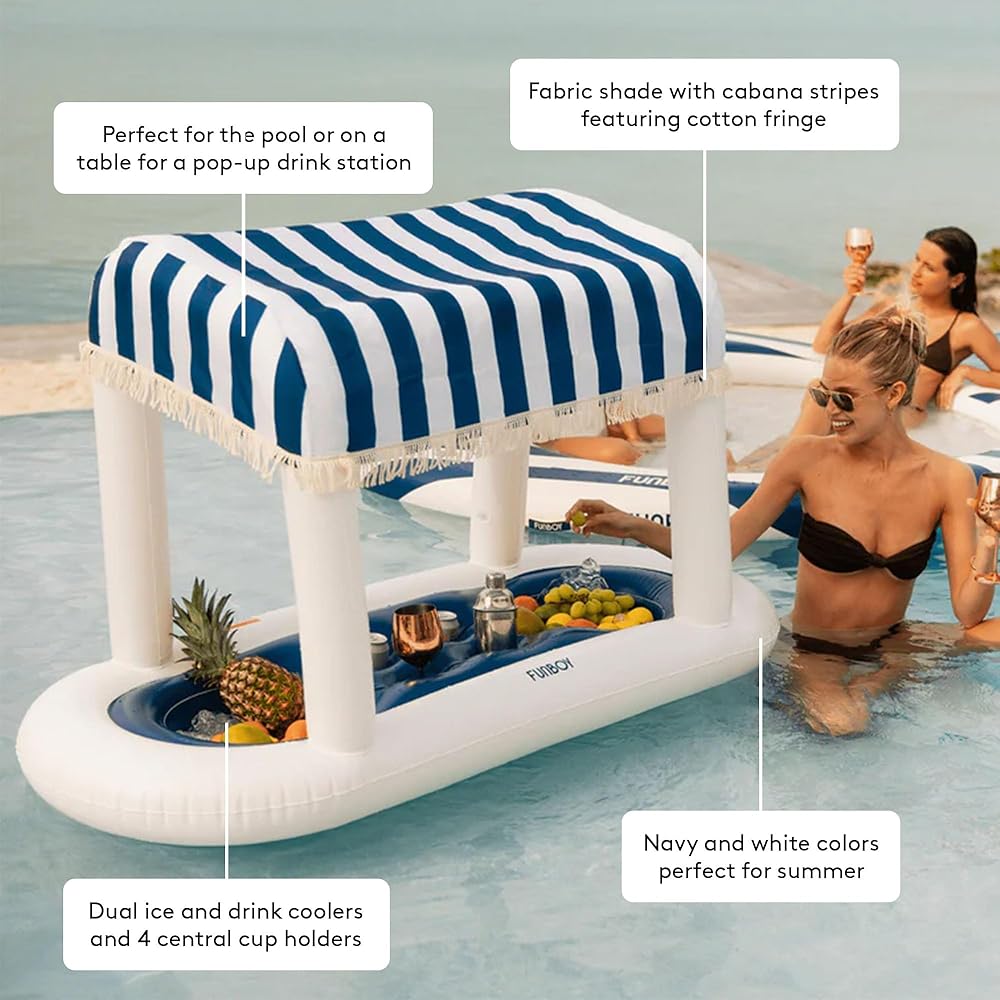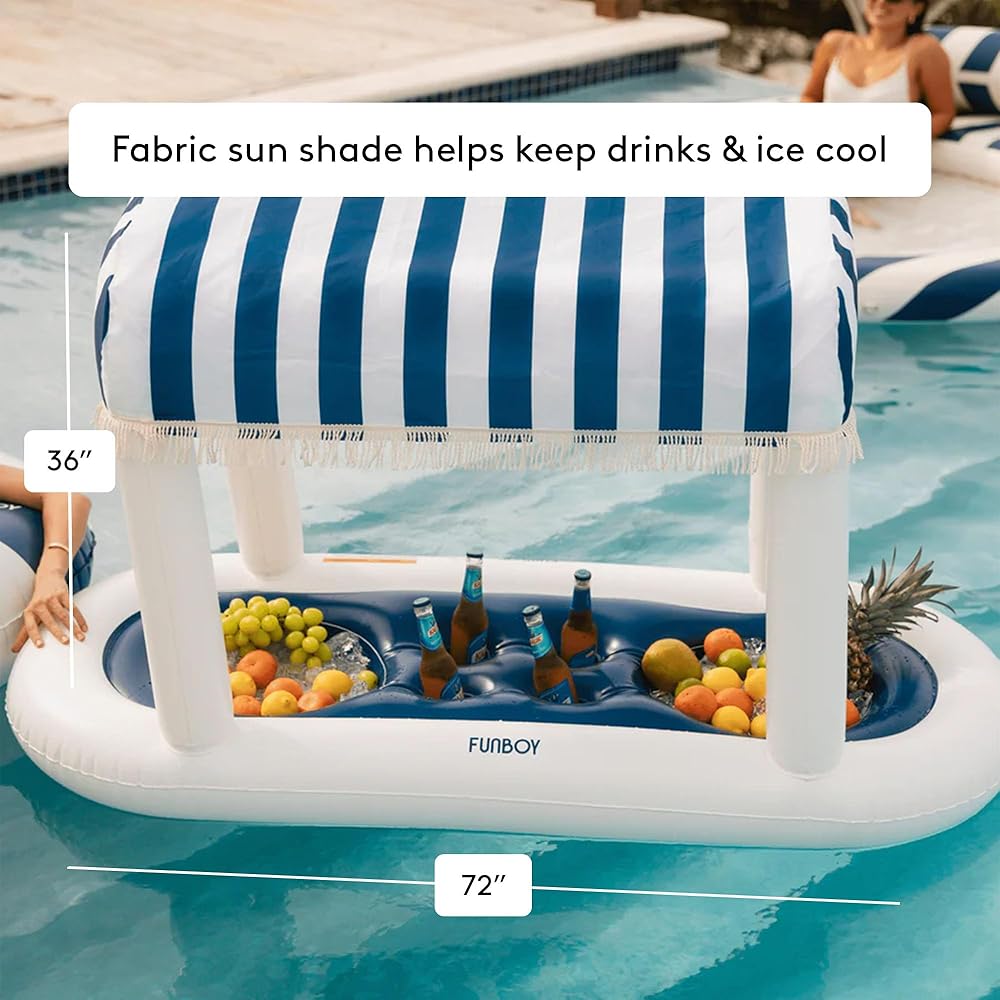 Introducing the FUNBOY Floating Cabana Bar – a must-have for outdoor enthusiasts and entertainers alike! Boasting an impressive length of nearly 6 feet, this versatile accessory adds a touch of fun to any outdoor gathering. Whether you're looking to create the ultimate floating drink station in the pool or elevate your table setup at the next outdoor party, the Floating Cabana Bar has got you covered. Featuring two drink stations that hold over 12 cans each and 4 central cup holders. Removable fabric shade lined with fringe augments any pool or backyard setting!