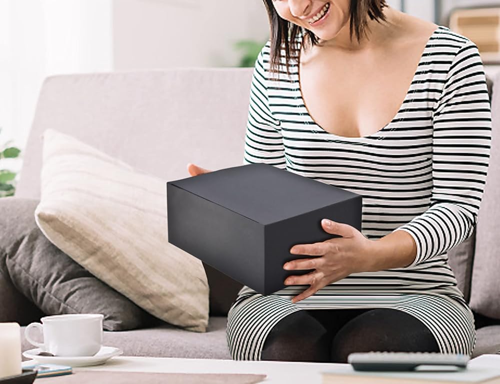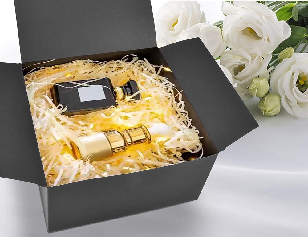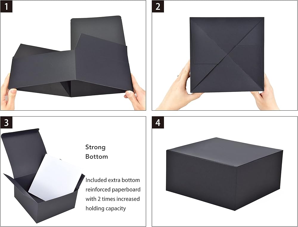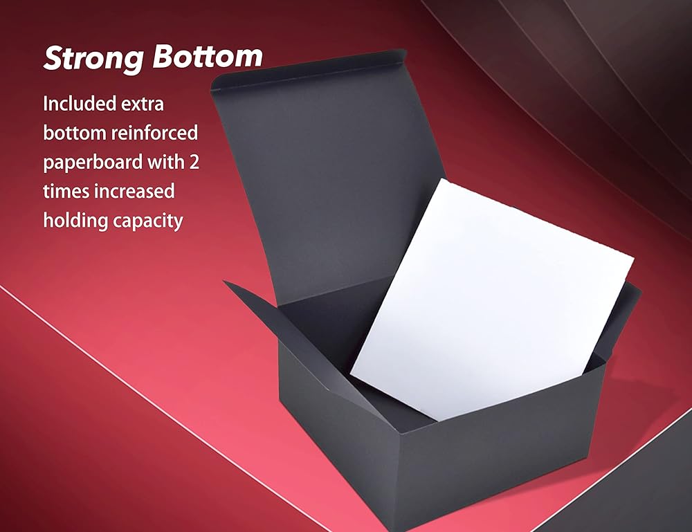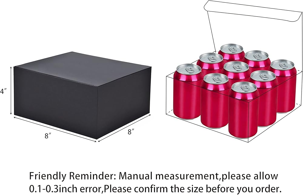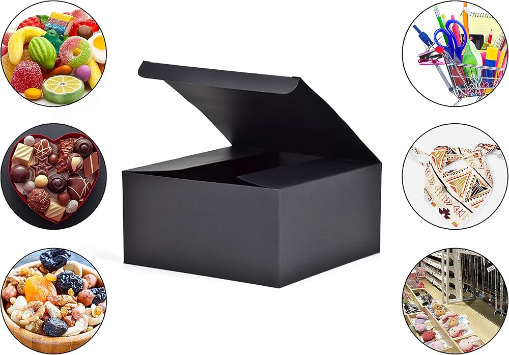 • صناديق هدايا الأكواب السوداء: يتم تجميعها في ثوانٍ، تأتي صناديق الهدايا الورقية في 24 قطعة، يبلغ مقاس كل صندوق هدايا على شكل قبعة 9.5 بوصة طولًا × 6.5 بوصة عرضًا × 4 بوصة عمقًا. صناديق الهدايا القابلة لإعادة التدوير هي الحجم المثالي لصندوق هدايا وصيفة العروس وصندوق هدايا الزفاف.