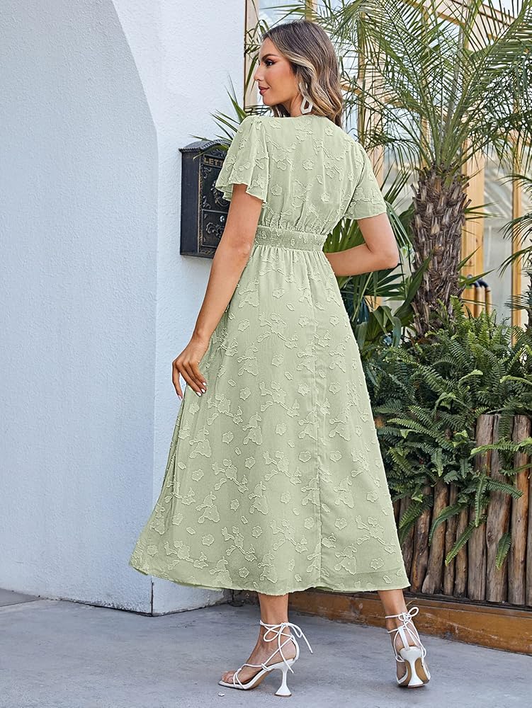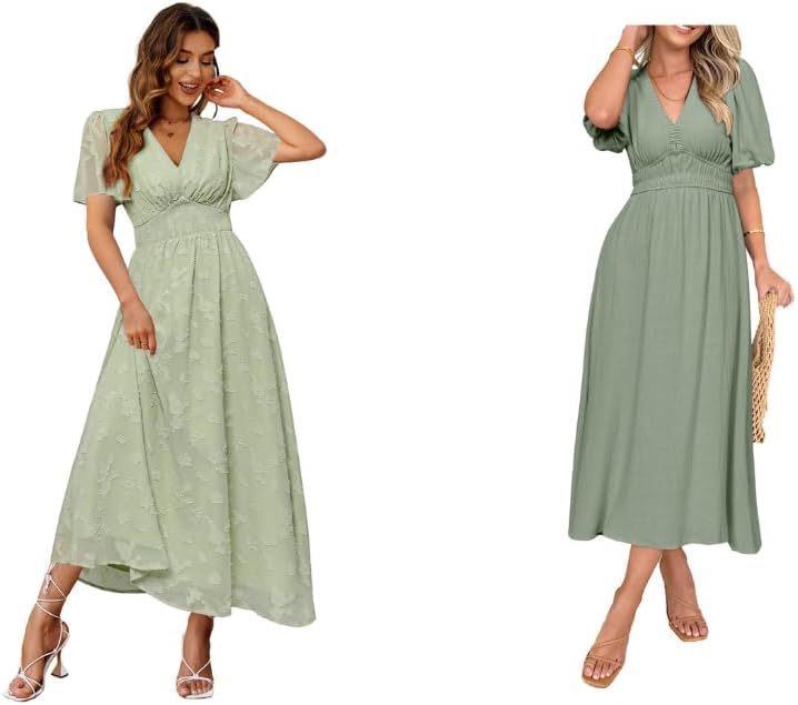 Simplee Women's Boho Floral V Neck Short Sleeve Formal Maxi Ruffle Dress Summer Long Flowy Lace Bridesmaid Wedding Party Evening Dress&Simplee Women's Summer Boho Maxi Dress Casual V Neck Puff Sleeve Wedding Guest Dress Flowy Linen Beach Dresses(S Sage Green)