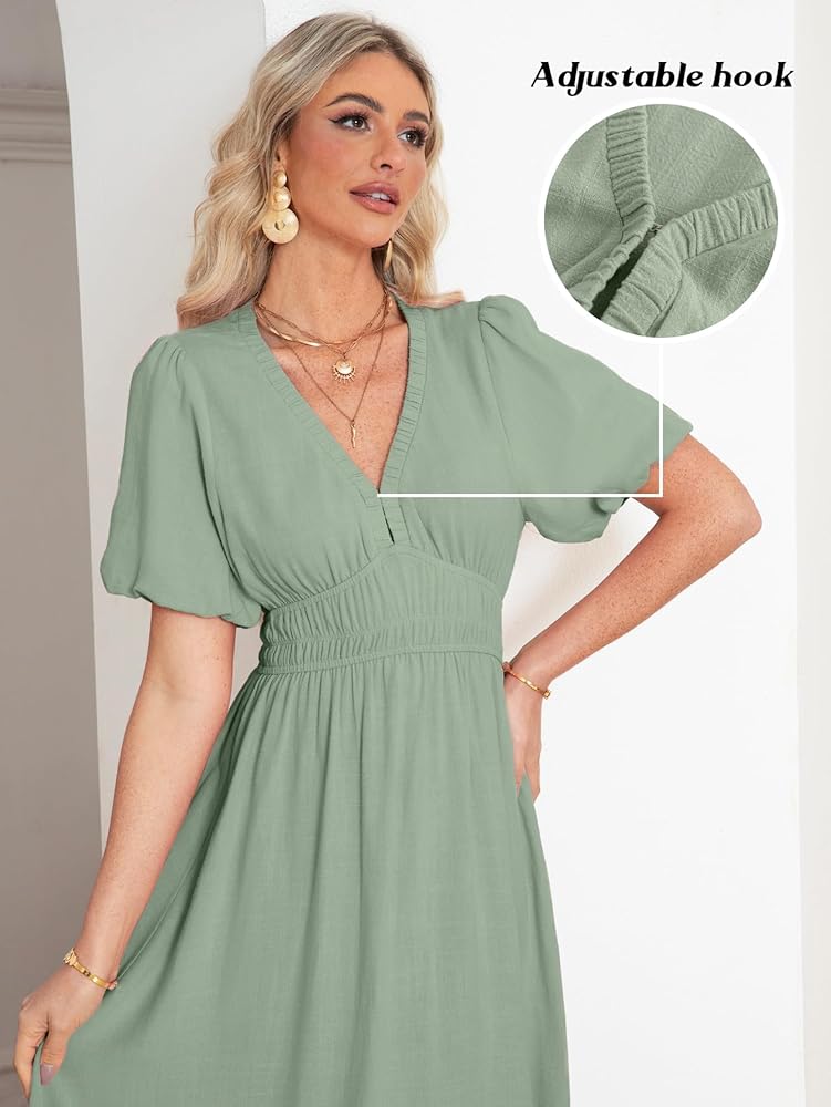 【Design】Summer linen maxi dress features empire waist and deep v-neckline, giving it a unique and stylish look. Puff sleeve long flowy dress, can be easily paired with high heels or sandals to make you look elegant in the crowd.