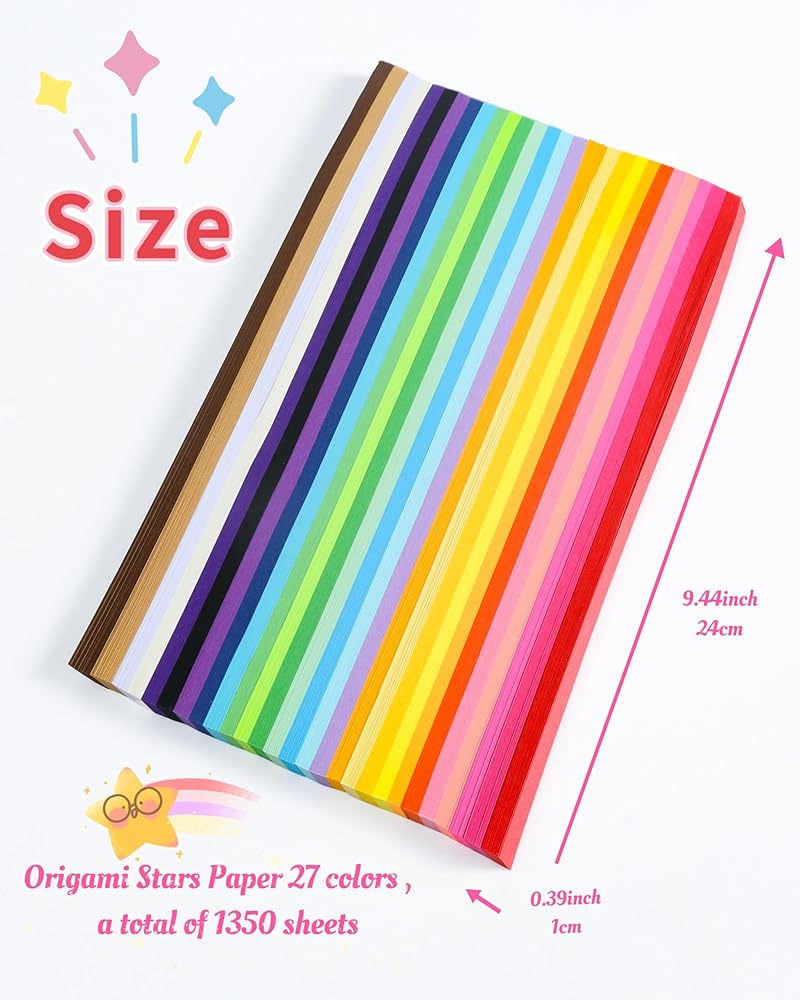 ★ تغليف ورق النجمة: 1350 ورقة من ورق النجمة الورقية مع 27 لونًا جميلاً، مناسب للمعلمين والأطفال. ستشعل هذه الأوراق الملونة إبداعك وتسمح لك بإنشاء إبداعك الجذاب المكون من 1350 نجمة. مثالية للمشروعات التي تصنعها بنفسك، وديكورات العطلات، والتعليم المدرسي، والاستمتاع بمتعة ذوق الأوريجامي.