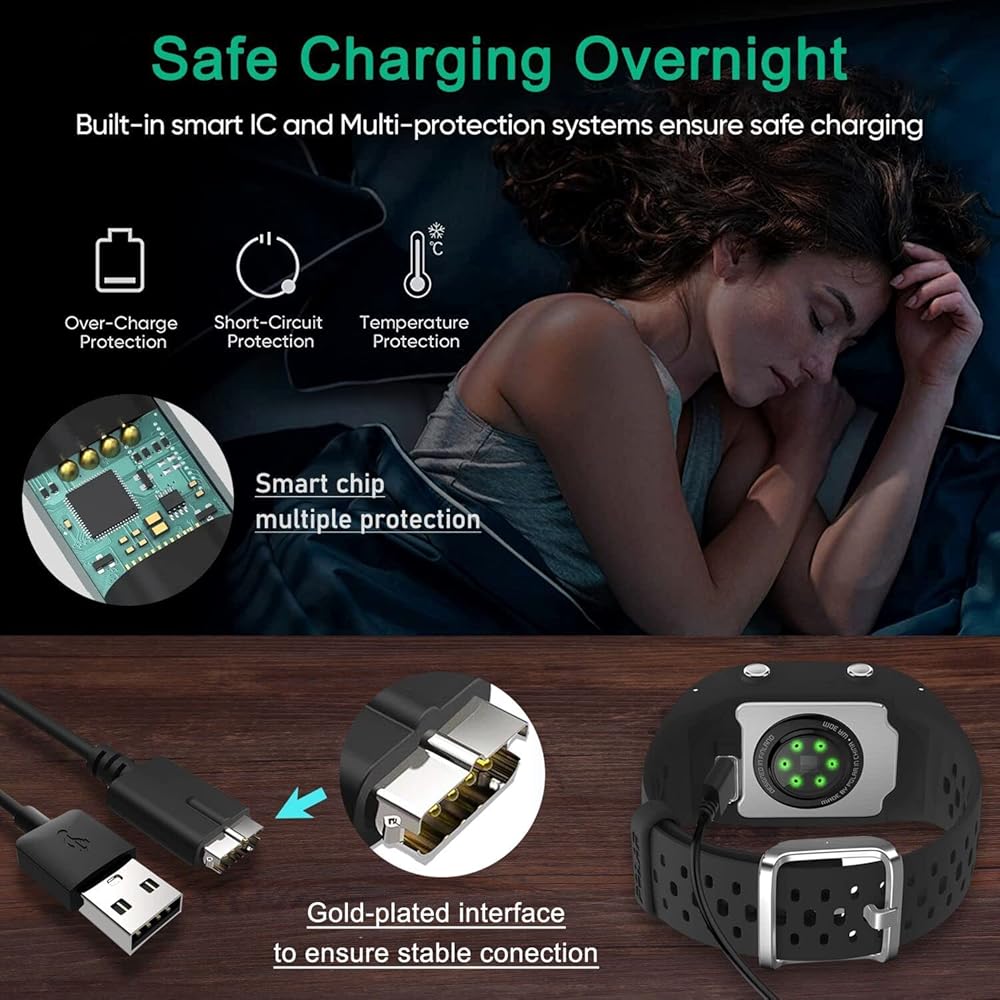• 【شحن آمن】: يحتوي كابل الشحن هذا على منظم جهد كهربائي وPTC بالداخل لحماية جهازك من التلف بسبب التيار الزائد عند توصيله بمصدر الطاقة. مصنوعة من حماية من الجهد الزائد والتيار الزائد، وسوف تحمي ساعتك من التلف عند الشحن.
