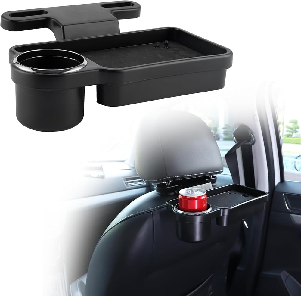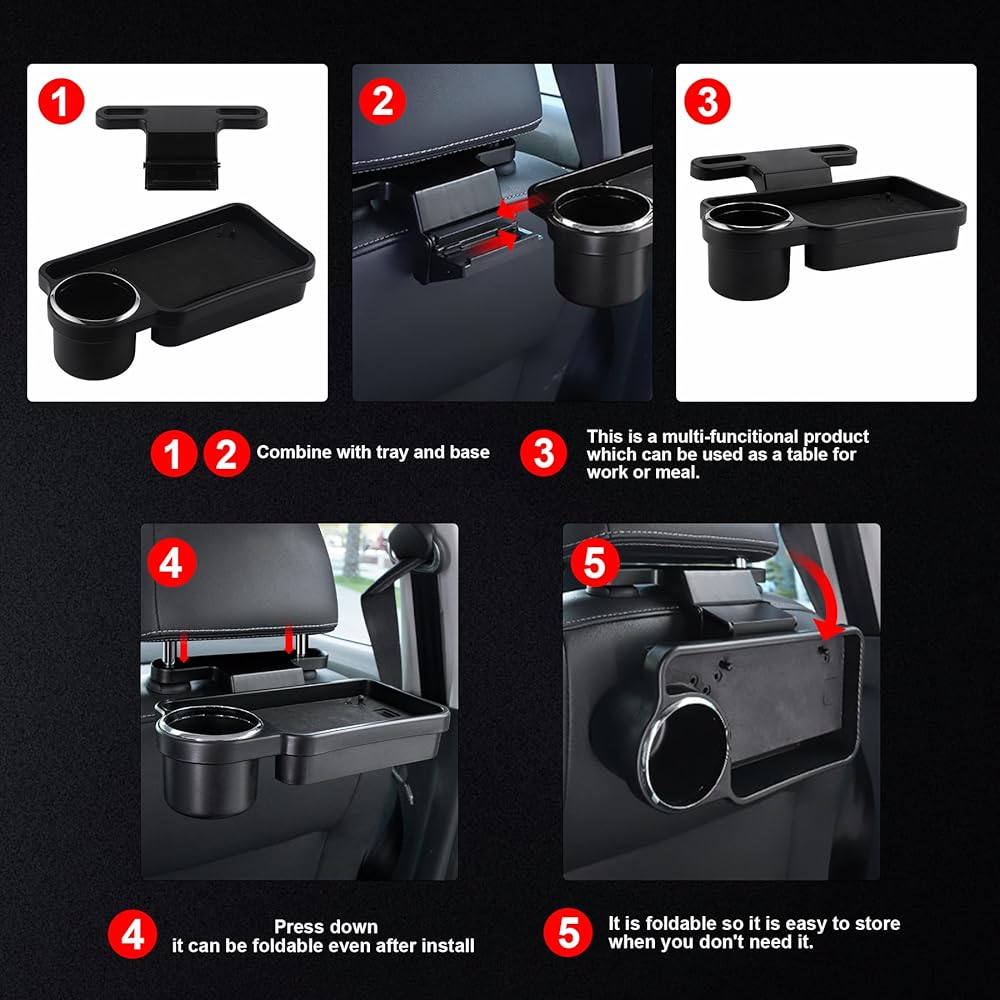 Easy Installation: The cudp and cell phone holder is very easy to install, #1remove headrest #2the tray base goes directly to the the headres, #3 headrest goes back in #4 the tray clips to the base, (press down to secure). it can be folded and slides left or right, for your best confort.