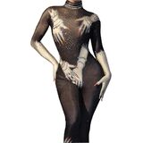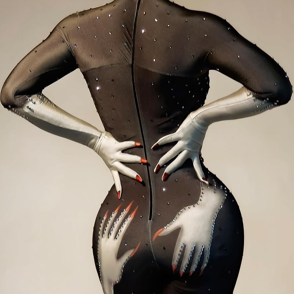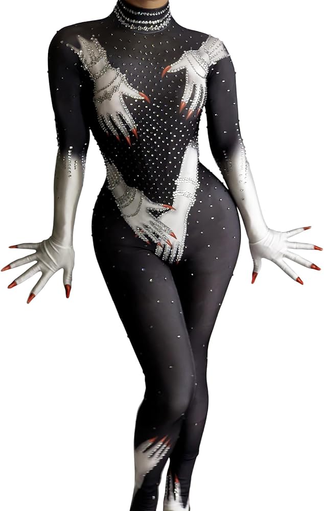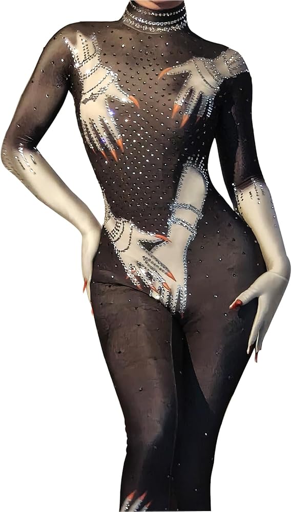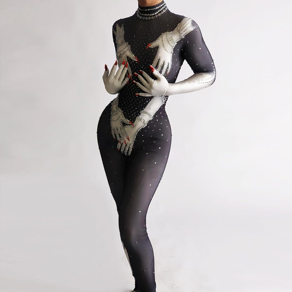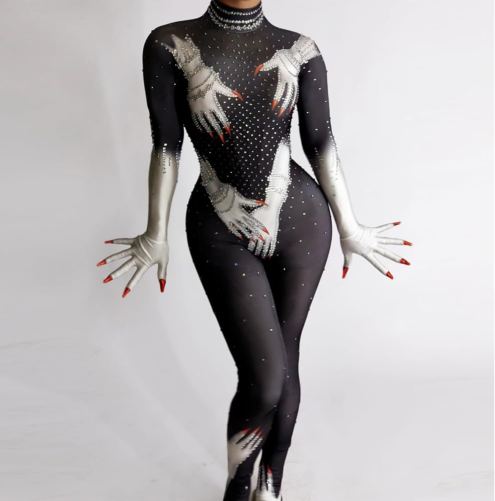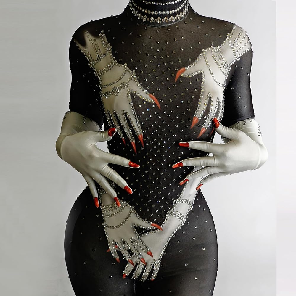 STYLE:Sexy 3D sexy rhinestone Hands Printed Jumpsuit are Black Gloves with trendy and unique patterns women drag queen Costumes bodysuit jumpsuits spandex wear