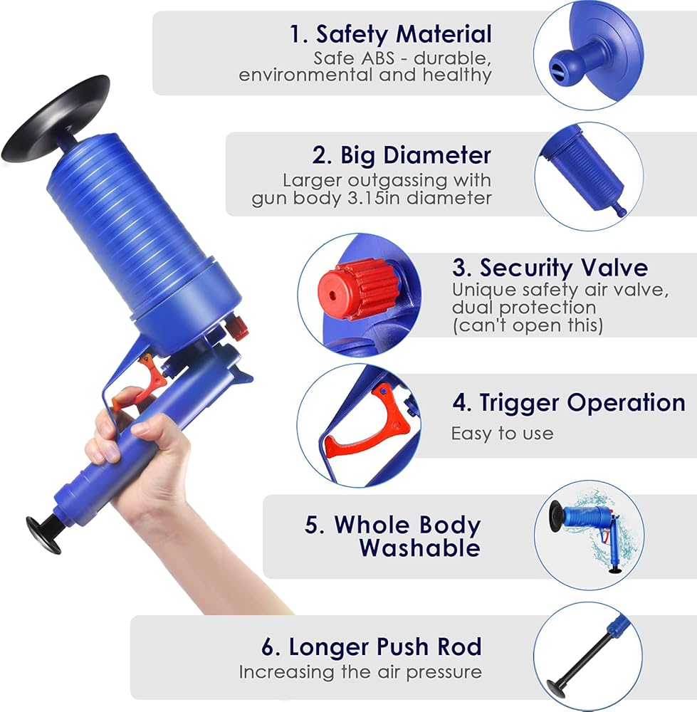 صديق للبيئة - جسم مسدس ABS، رأس مسدود من المطاط الطبيعي. مطاط طبيعي قوي ومتين من أجل مزيل انسداد الصرف الخاص بنا. يستخدم مكبر الصرف قوة الهواء المضغوط عالي الضغط للتخلص من أصعب الانسدادات في المصارف في ثوانٍ معدودة. ما عليك سوى ضخ ناسف الصرف والضغط على الزناد، ويتم تنظيف الانسداد على الفور. أسرع بكثير من الغطاسات التقليدية والثعبان ولا مزيد من إضاعة الوقت في فتَّاحات الصرف.