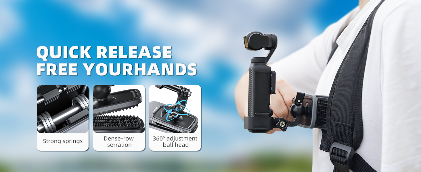 • التثبيت السريع أو الإزالة: يمكن أن تعمل آلية القفل في اتجاه عقارب الساعة وميزة فتح عكس اتجاه عقارب الساعة على تمكين تثبيت جيب osmo 3 أو كاميرا الحركة الأخرى بسهولة بخطوة واحدة فقط.