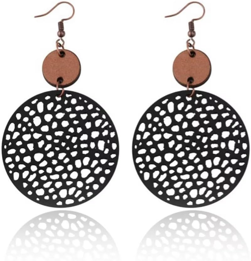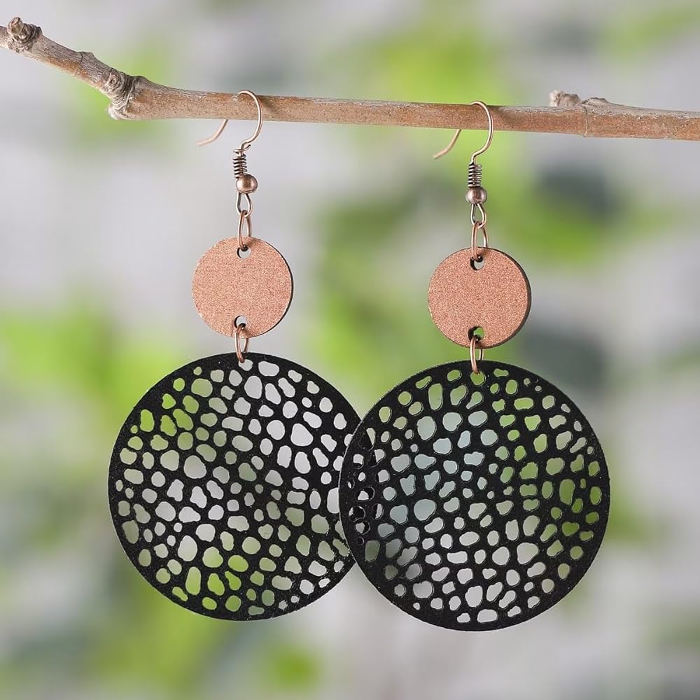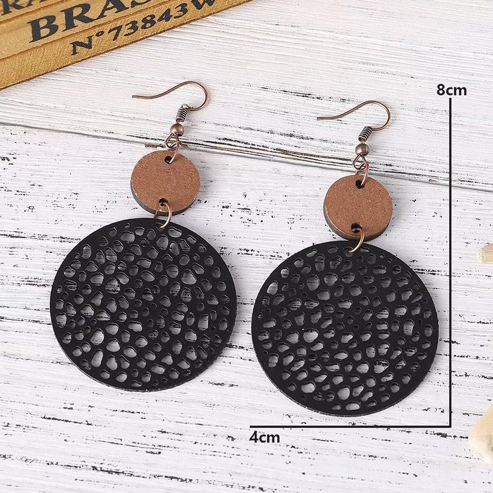• Material:This Wooden Round Geometric Earrings Made Of High-Quality Alloy, Wood And Leather, Lightweight And Comfortable, And Easy To Wear. Earrings Have Two Circles Of Different Sizes. The Big One Is Made Of Leather And The Small One Is Made Of Wood.