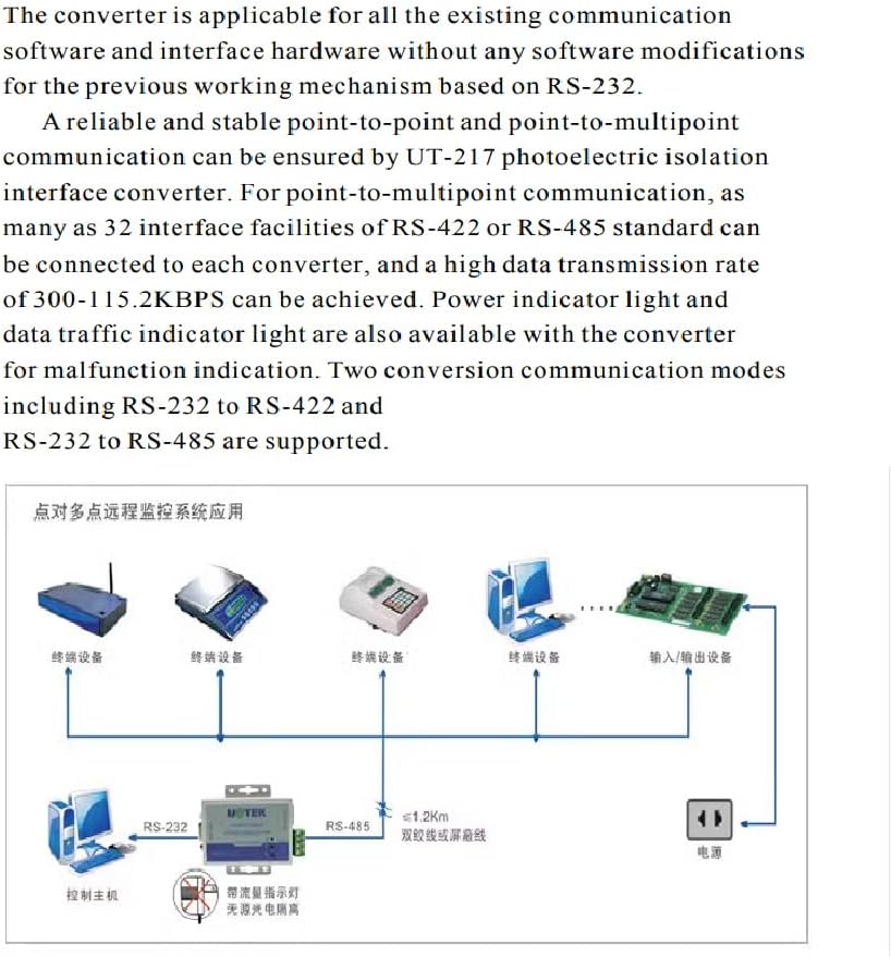UT-217E optoelectronic isolated port-powered converter provides connection for point to point, point to multipoint communication. For point to multipoint mode, each converter is allowed to connect 32 sets RS-422 or RS-485 devices with baudrate 300-115.2Kbps. The power and data flow indicators indicate the working status.