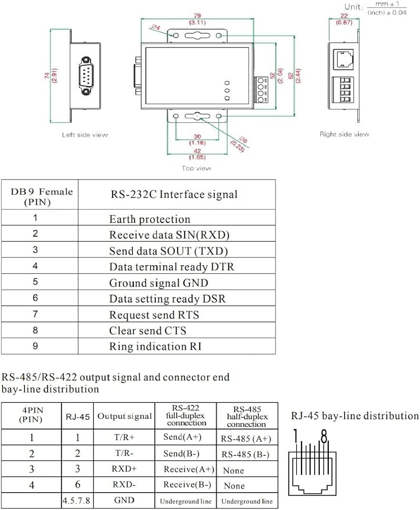 • Connector: RS-232 DB9 female; RS-485/422 4 bits terminal block & RJ-45 ● Transmission media: twisted-pair or shielded cable ● Dimension: 79mm×74mm×22mm