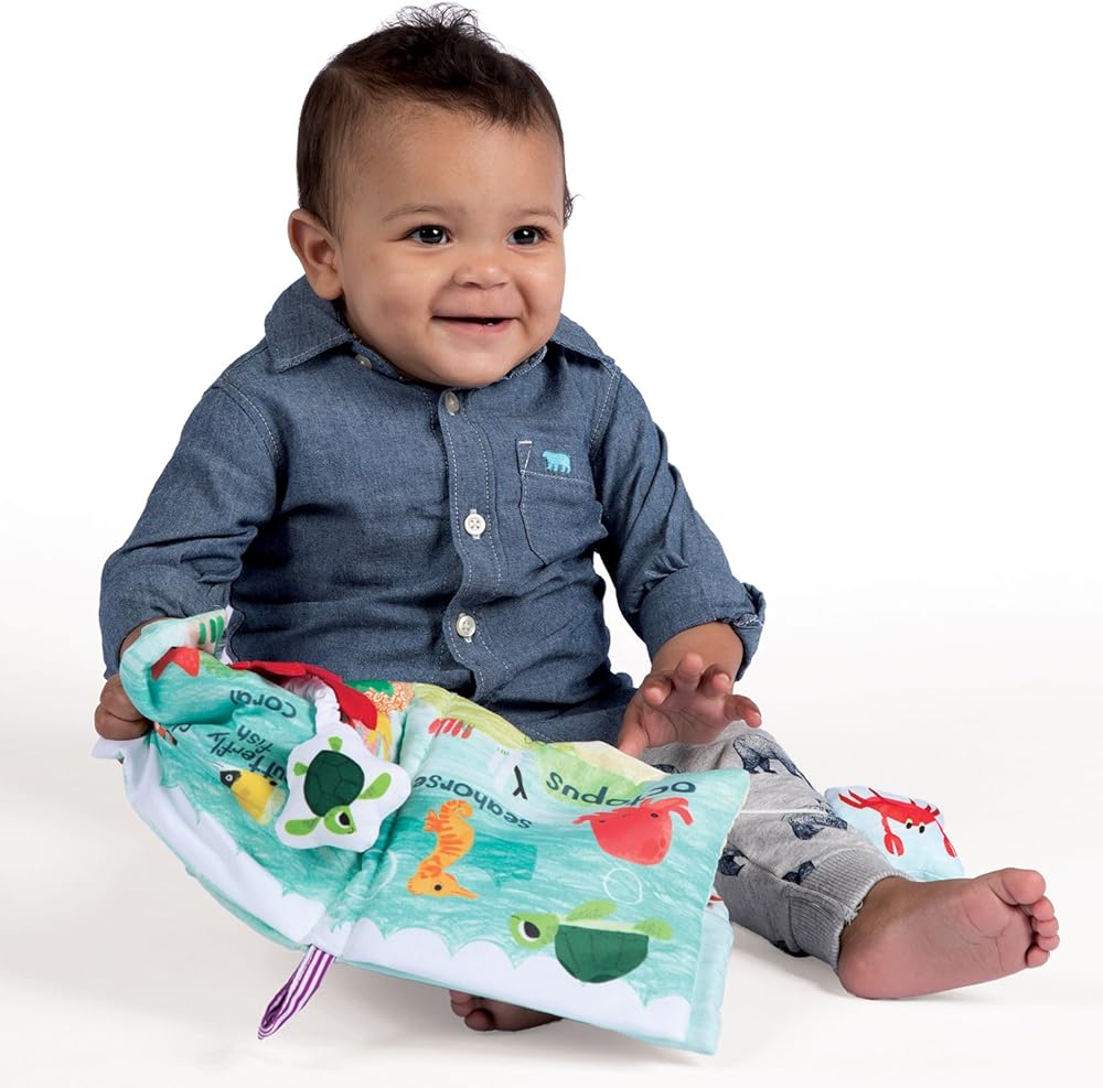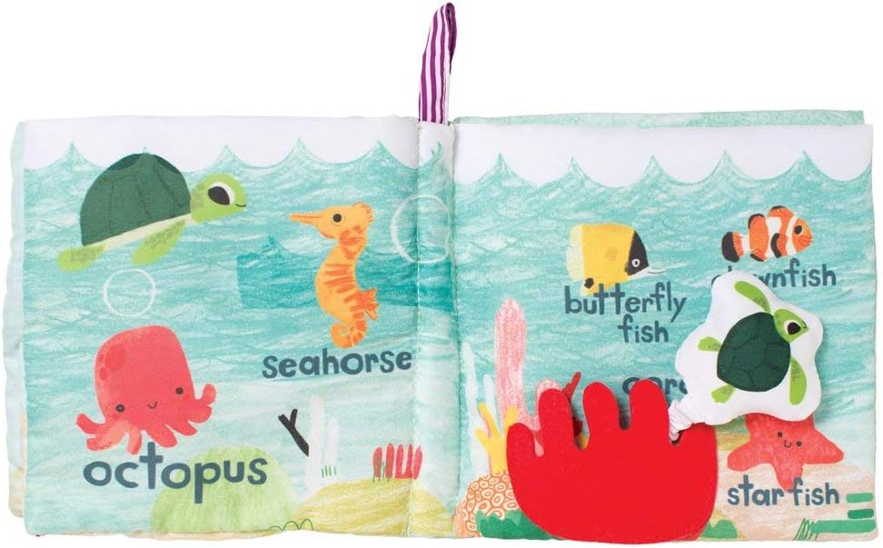 Discover sea creatures on this baby turtle story adventure. Every page has colorful new ocean animals to discover, along with a variety of fabric textures, tethered on characters and even crinkle paper! This soft baby book also includes a squeaker, rattle and fabric loop for hanging or attaching to baby links. Enjoy all six pages of this soft book during your next story time with baby. Since 1978, Manhattan Toy has been making award-winning, high quality, educational toys for your baby, toddler or kid. From infant toys and baby toys to sensory development toys, our goal is to provide the safest and best toys available.