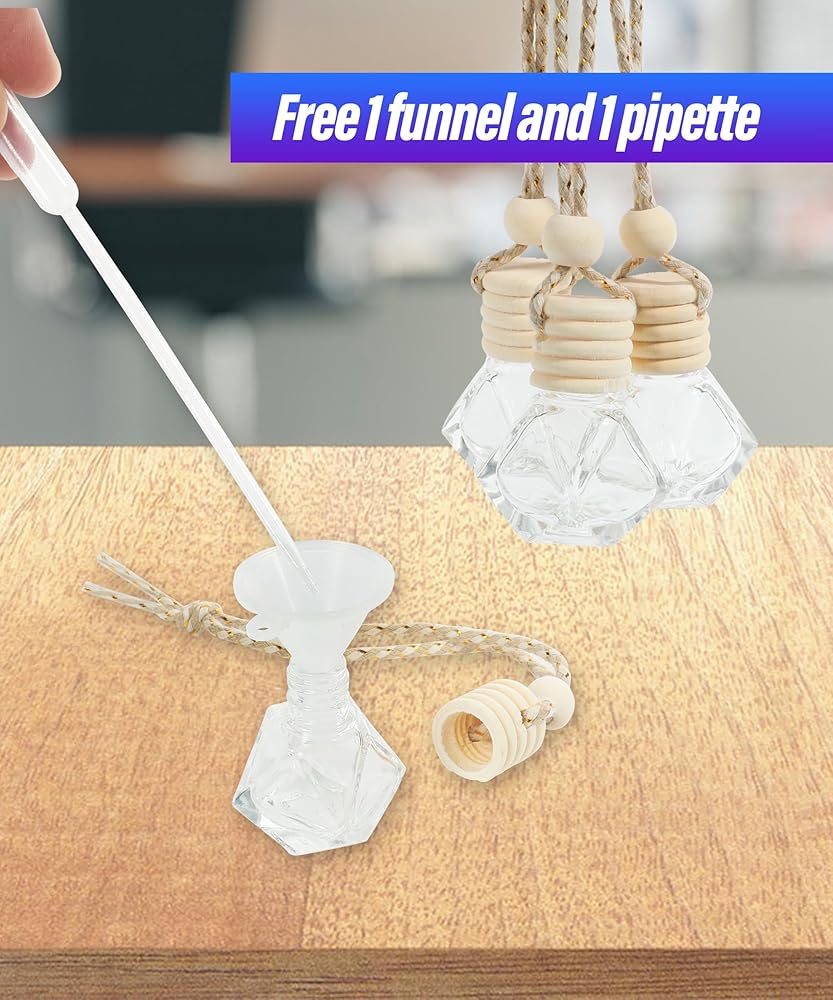 [Package Contains] The package contains five car perfume glass bottles, each of which is equipped with an inner stopper, a wooden cap, a sling, a funnel and a pipette. Does not include essential oils or perfume.