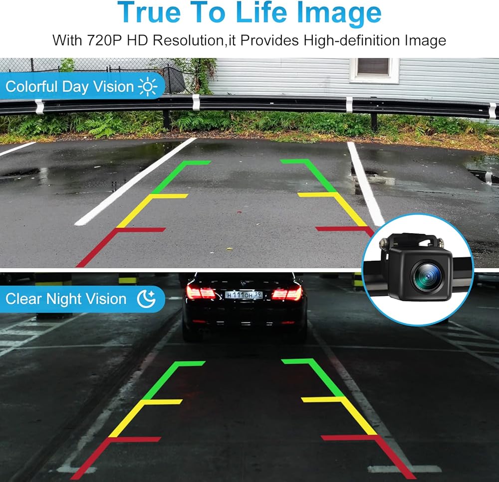 زاوية عرض قابلة للتعديل من 90 درجة إلى 120 درجة: على عكس كاميرات السيارات القديمة التي يمكنها فقط ضبط زاوية الرؤية عن طريق إضافة حشوات، يمكنك العثور على رؤية مثالية عن طريق ضبط الكاميرا مباشرة لأعلى وأسفل. صورة منخفضة جدًا تظهر على الشاشة.