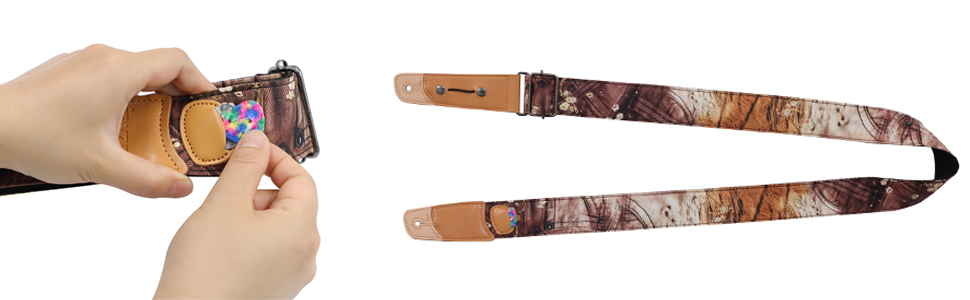 نهايات الجلد الصناعي عالية الجودة متينة مثل الجلد الأصلي. حامل اختيار على أحد الأطراف للوصول السريع إلى اختياراتك في أي وقت. يتم تضمين سلسلة ربط للالتفاف حول رقبة آلتك إذا لزم الأمر.