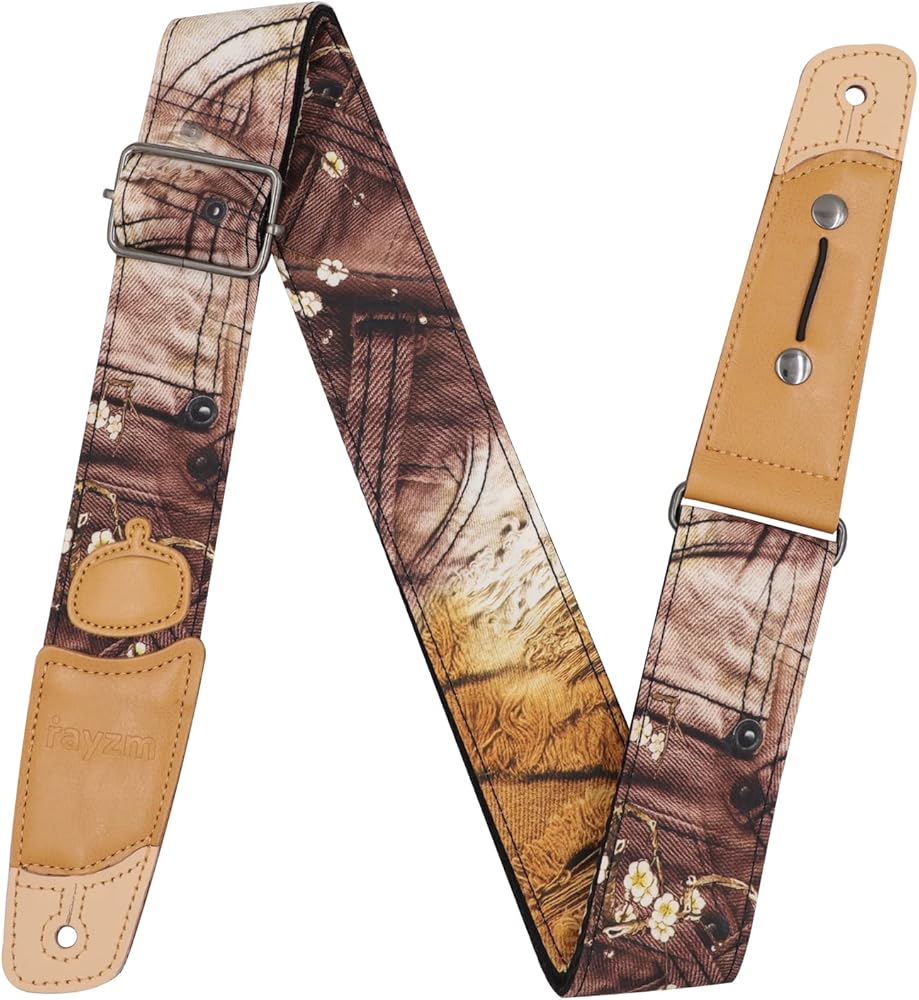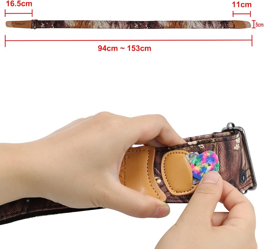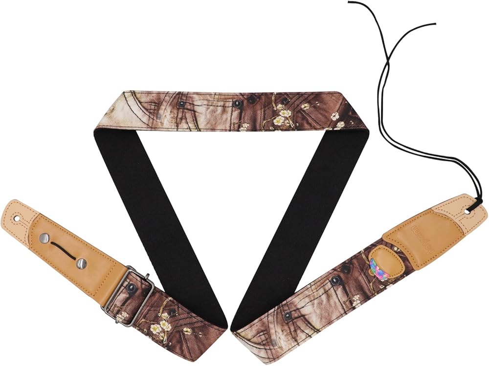 الجانب الأمامي للحزام مصنوع من النايلون مع نمط الدنيم المطبوع بشكل جميل، والجانب الخلفي مصنوع من القطن الأسود المضاد للانزلاق. حتى الغرز الموجودة على الحزام، فهو متين للحفاظ على الجيتار الخاص بك آمنًا، ولا ينزلق من كتفك!