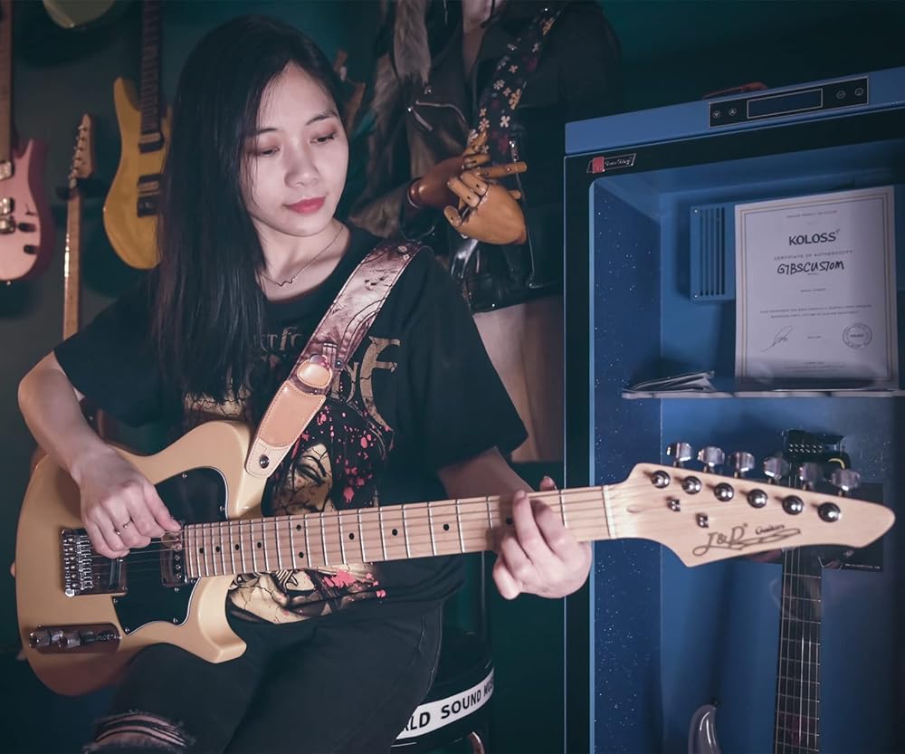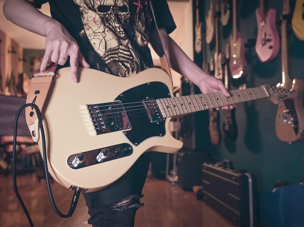 يوجد فتحة مرنة في الطرف الخلفي للحزام. يمكن أن يمر كابل الجيتار ذو القابس المستقيم من خلال هذه الفتحة لتسهيل أدائك.