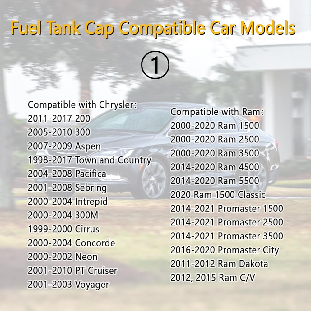 • ⭐ Compatible with Dodge:This gas tank cap is also compatible with Dodge 1998-2020 Grand Caravan, 2009-2020 Journey, 2000-2010 Dakota, 2013-2016 Dart, 2001-2018 Durango, 2001-2007 Caravan, 2008-2012 Caliber, 2006-2010 Charger, 2008-2013 Challenger, 2008-2014 Avenger, 2000-2004 Intrepid, 2005-2008 Magnum, 2000-2005 Neon.