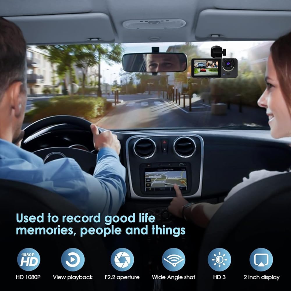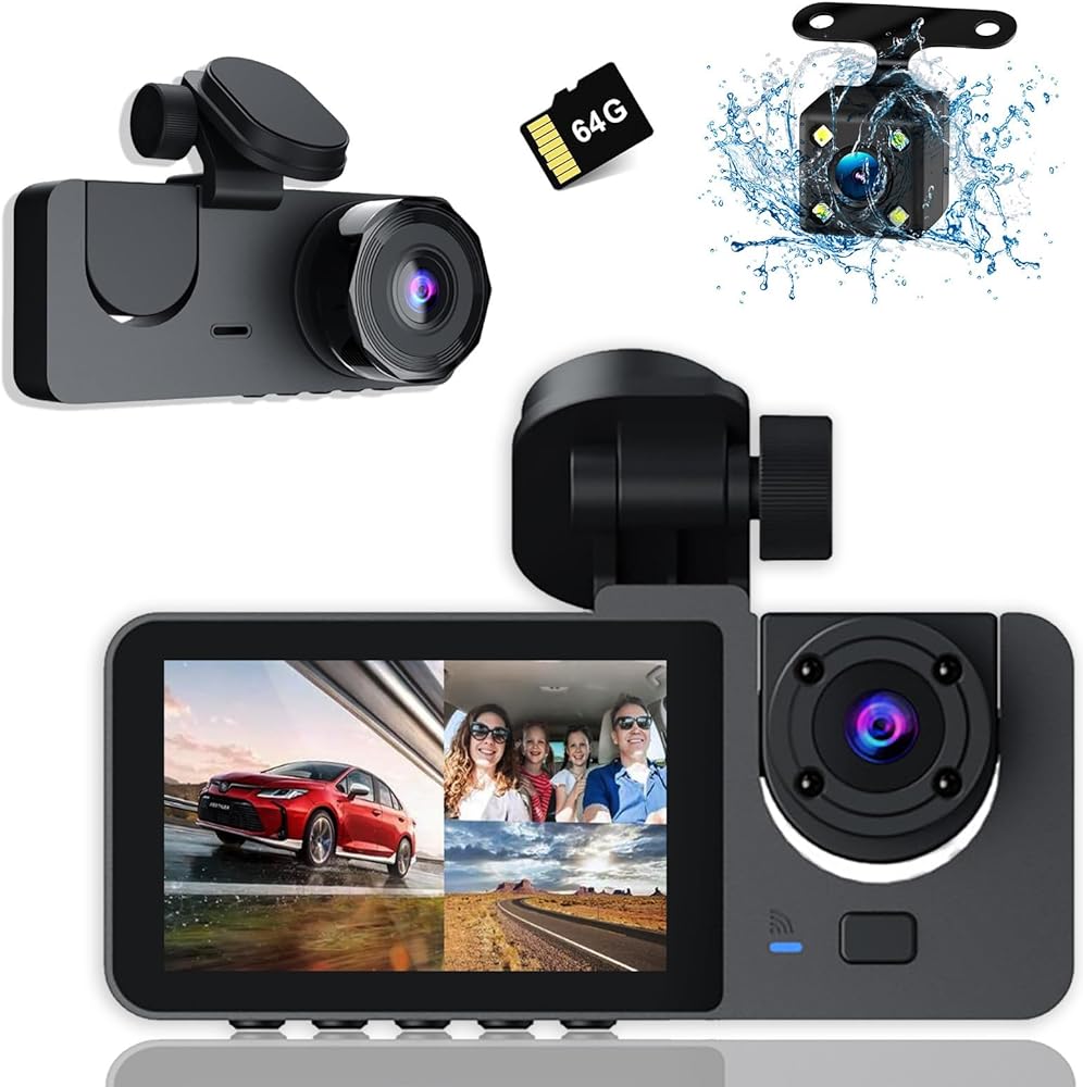 كاميرا داش كام، كاميرا داش كام ثلاثية القنوات أمامية وخلفية من الداخل، كاميرا لوحة قيادة بزاوية واسعة 1080 بيكسل كاملة الوضوح 170 درجة مع بطاقة 64 جيجابايت، مع رؤية ليلية بالأشعة تحت الحمراء، شاشة IPS مقاس 2 بوصة، مستشعر G، تسجيل حلقي