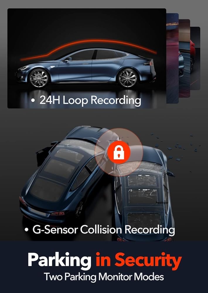 🚕【Dash Cam】When the dashboard camera detects a collision, it will automatically turn on and then record a protected video. The collision detection or motion sensor can be triggered by impact or movement while parked, or if someone tries to steal your vehicle.