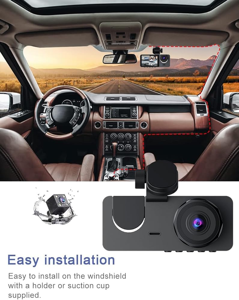🚕【Hidden Design and Easy Installation Dashcam 】Dashcams combine three cameras in a compact size, it doesn't block your view or distract you while driving. The front camera can be easily installed on the windshield and connected to a power source, while the rear camera is simple to install and can be used by connecting to the front lens without removing the reverse headlight.