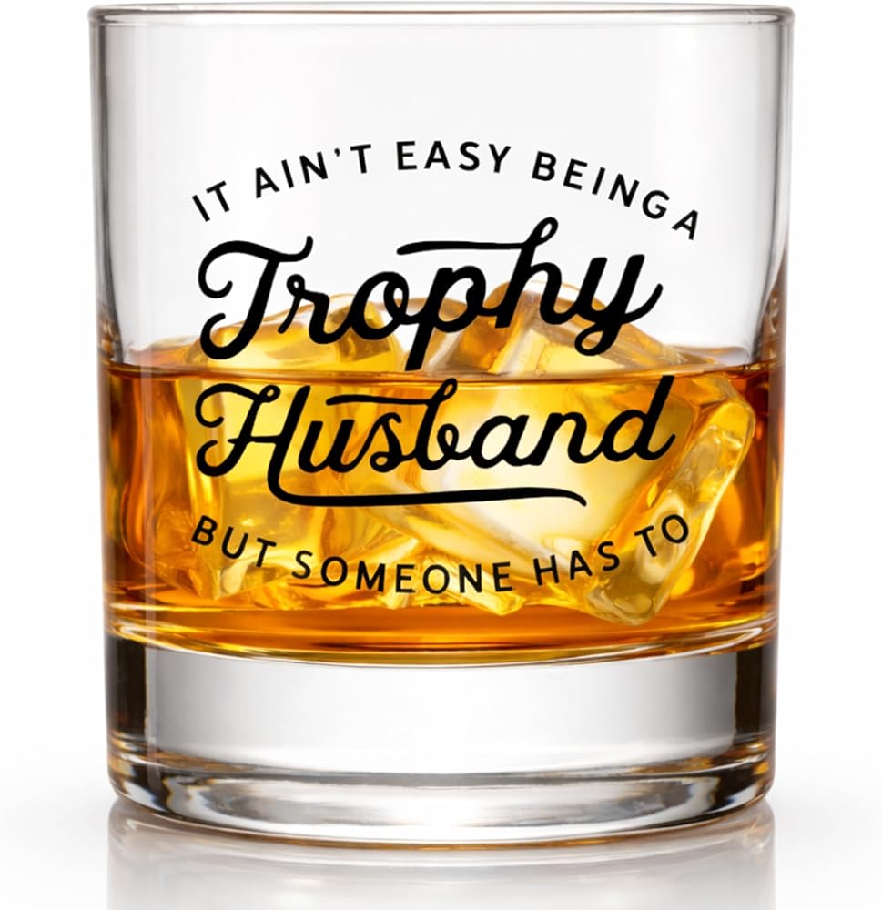 PERFECT GIFT FOR YOUR HUSBAND - Looking for the perfect gift for men on Fathers day, anniversary, birthdays, Valentines day, new dad, or any other special occasion? This "Trophy Husband" bourbon glass is sure to bring a smile to any husbands face. PREMIUM WHISKEY GLASS WITH FUNNY SAYING - At Glassicle, we we only use premium glassware. This whiskey glass has a heavy base with a classic look that every bourbon lover will enjoy. Perfect for any special occasion or milestone birthday...30th, 40th, 50th, 60th, 70th.