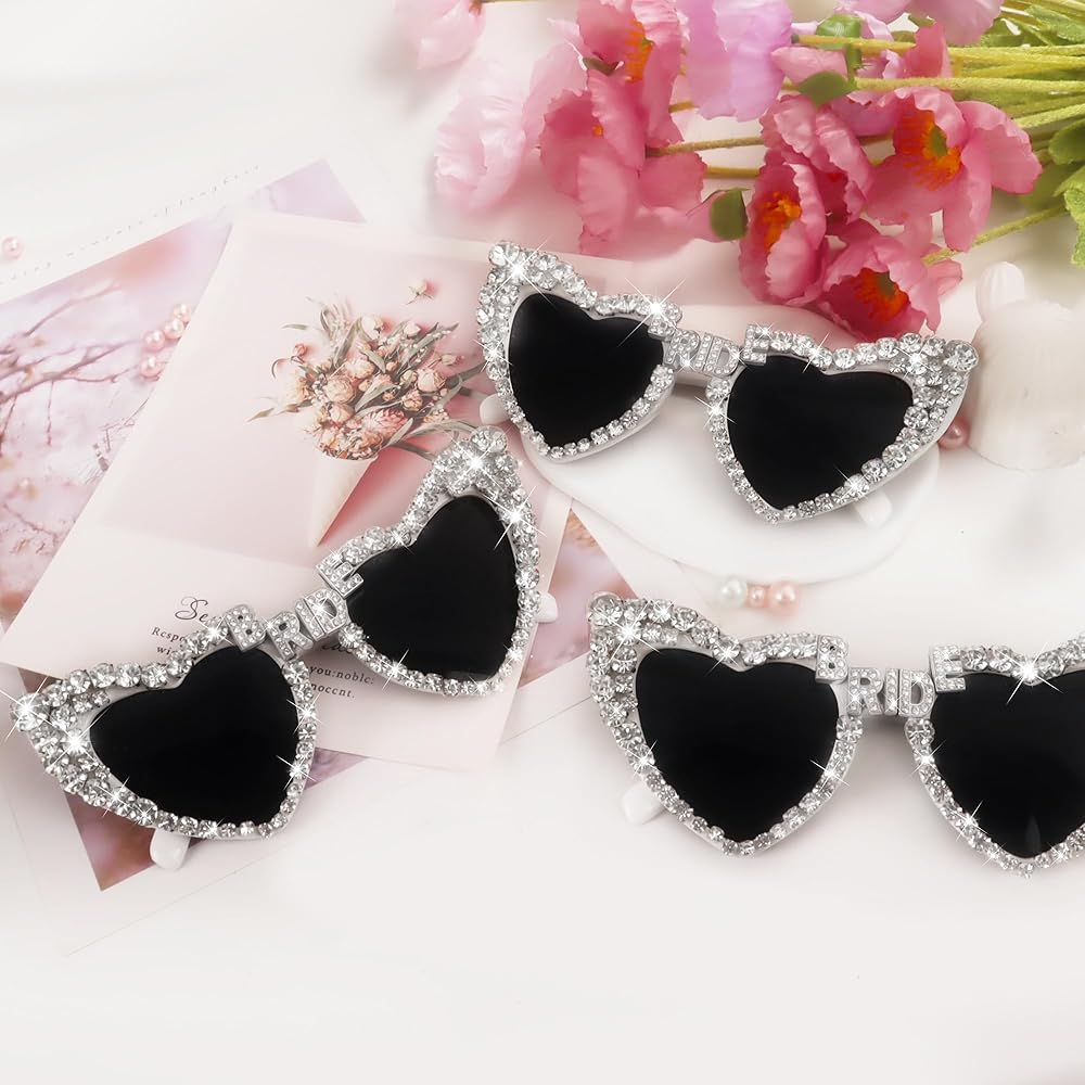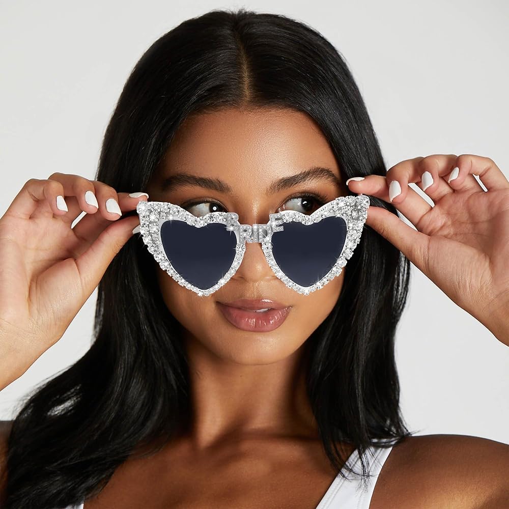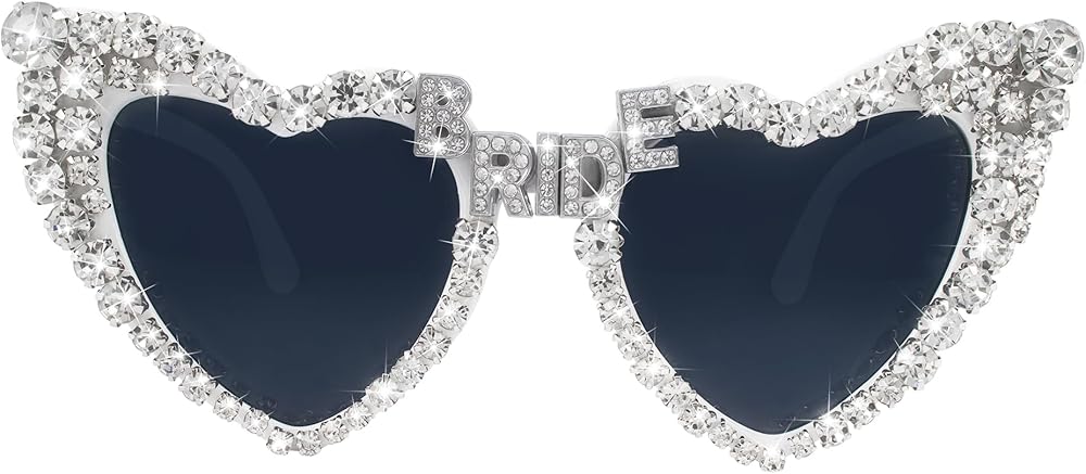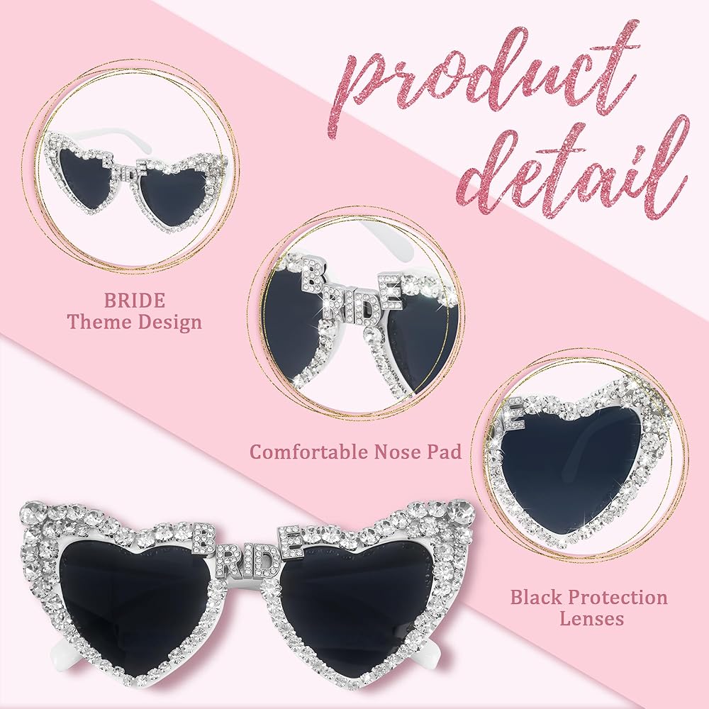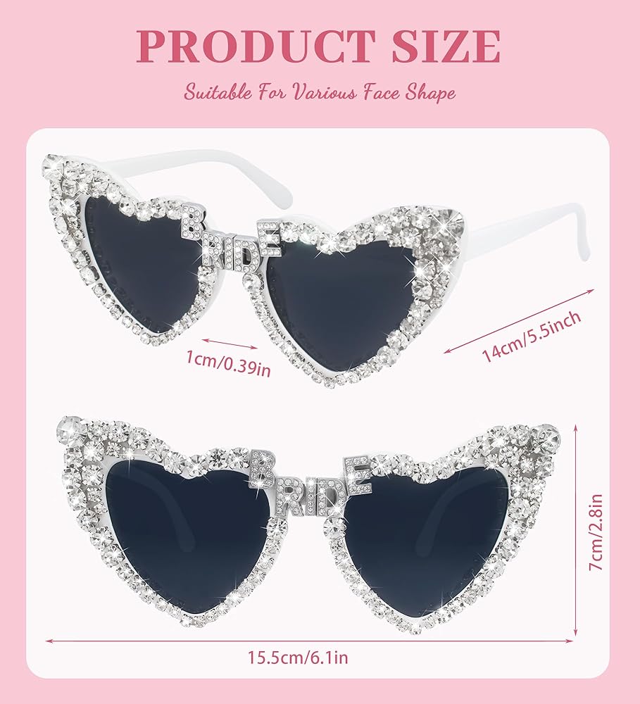 💎😎BLINGED-OUT BRIDE SUNGLASSES: Step into the limelight with these glamorous shades! The heart-shaped frame is adorned with shimmering rhinestone embellishments, creating an eye-catching look. The bridge features a sparkling BRIDE design that adds a touch of elegance. Get ready to shine like a star with these dazzling sunglasses! ✨