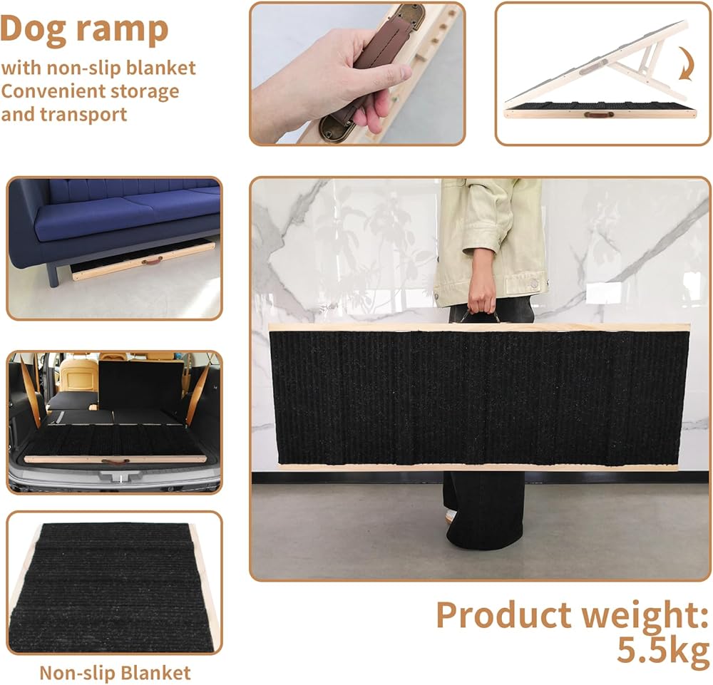 • لا يوجد تجميع وسهل الحمل: يمكن طي منحدر الحيوانات الأليفة، ويبلغ ارتفاعه 1.97 بوصة فقط. يمكنك تخزينها بسهولة في صندوق السيارة، أو تحت الأريكة أو السرير ولن تشغل مساحة كبيرة، وتوفر المساحة. الوزن 9.7 رطل فقط، يمكنك أخذه بسهولة إلى أي مكان تريد الذهاب إليه مع مقبض حمل الحزام على الجانب.
