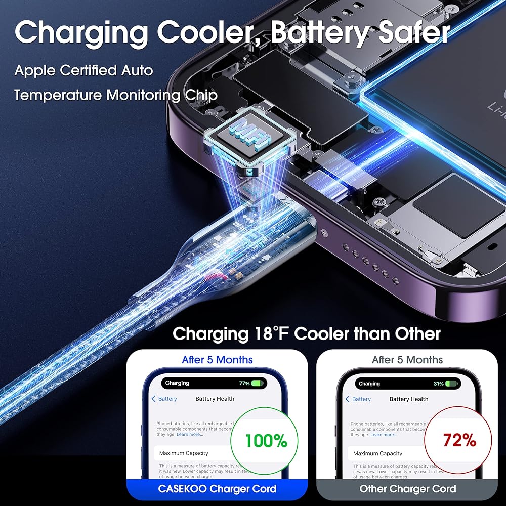 [اجعل هاتفك جاهزًا خلال 15 دقيقة] يستخدم كابل الشحن السريع CASEKOO هذا النحاس المصبوغ فائق التوصيل كمواد نقل حالية لتحقيق 0 خسارة شحن تيار. تم اختبار أنه يمكنه شحن الهاتف من 0% إلى 30% خلال 15 دقيقة، وهو أسرع بنسبة 200% من الكابلات النحاسية الشائعة الأخرى. قم بإحياء هاتفك بسرعة أثناء الاستعداد في الصباح أو في وقت راحة قصير، ولا داعي لانتظار الشحن بعد الآن.