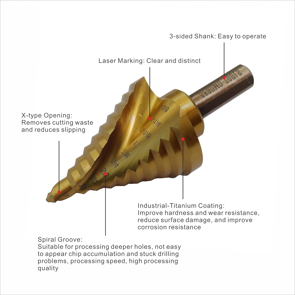 [ 11 STEPS ] Includes 1/4, 5/16, 3/8, 27/64, 31/64, 9/16, 39/64, 43/64, 23/32, 25/32 and 7/8 inch sizes allowing you to drill up to 11 holes with different diameters. [ M35 HSS STEEL ] Made from M35 High Speed Steel (HSS) for strength, durability (HRC60), accurate and precise drilling. Suitable for demanding drilling applications and can withstand higher temperatures generated during drilling which can lead to longer tool life and improved performance, especially in applications that generate a lot of heat. [ 2 SPIRAL ] Equipped with a 2 spiral groove and X-type opening to minimize friction during drilling, enhance chip evacuation by channelling debris away from the drilling area, provide added stability, process deeper holes and promote faster drilling speeds. 3/8 inch 3-sided shank for easy operation. [ HEAVY DUTY ] Industrial titanium coating for increased hardness (HRC60), wear and corrosion resistance, reduced surface damage, reduced friction and heat generation and fatigue resistance with clear and distinct sizing laser markings for high visibility. [ IDEAL FOR ] Drilling and enlarging holes, chamfering, deburring, 3mm stainless steel plates, 5mm iron sheets and aluminum sheets.