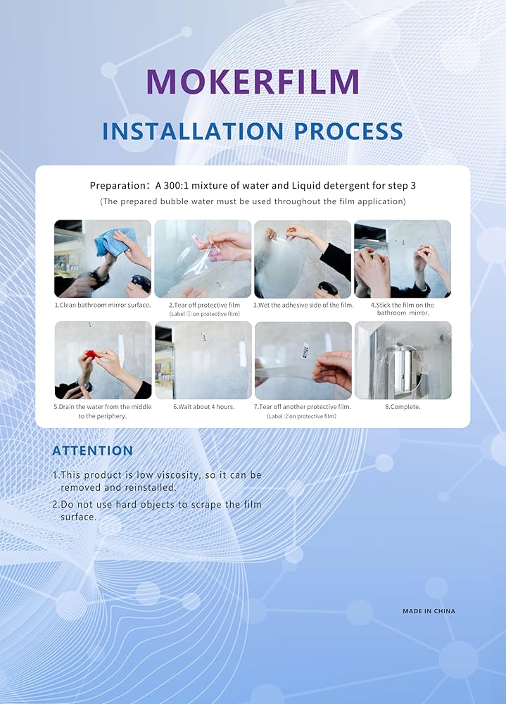 Easy Application: The transparent film adheres easily to any glass surface and can be cut to size. It is easy to install this anti fog film by using the scraper in the package and 300:1 mixture of water and liquid detergent