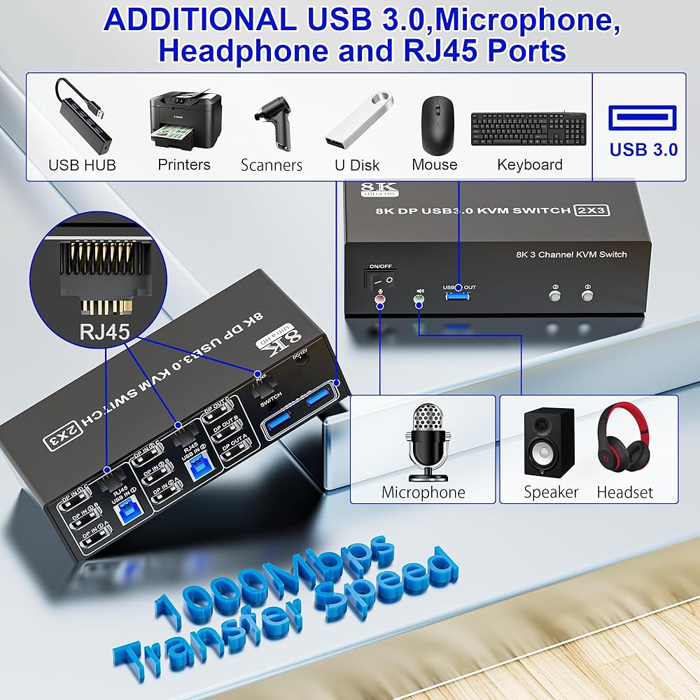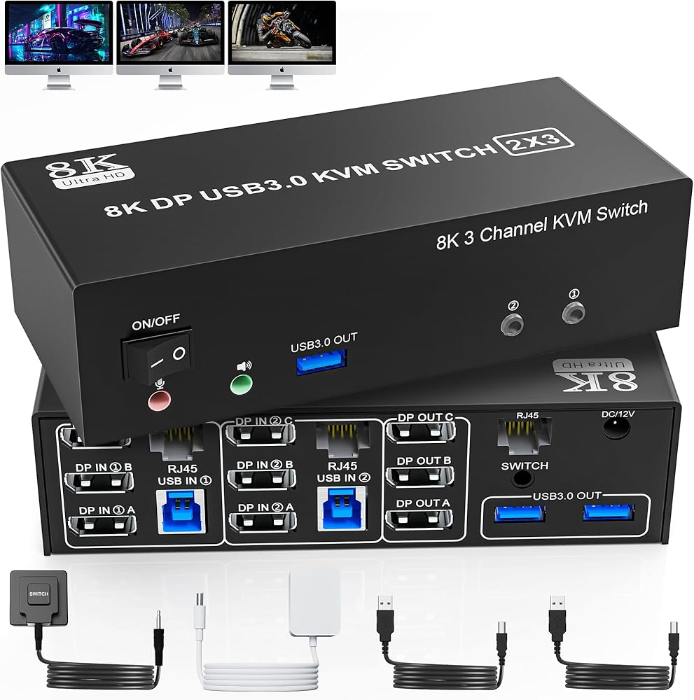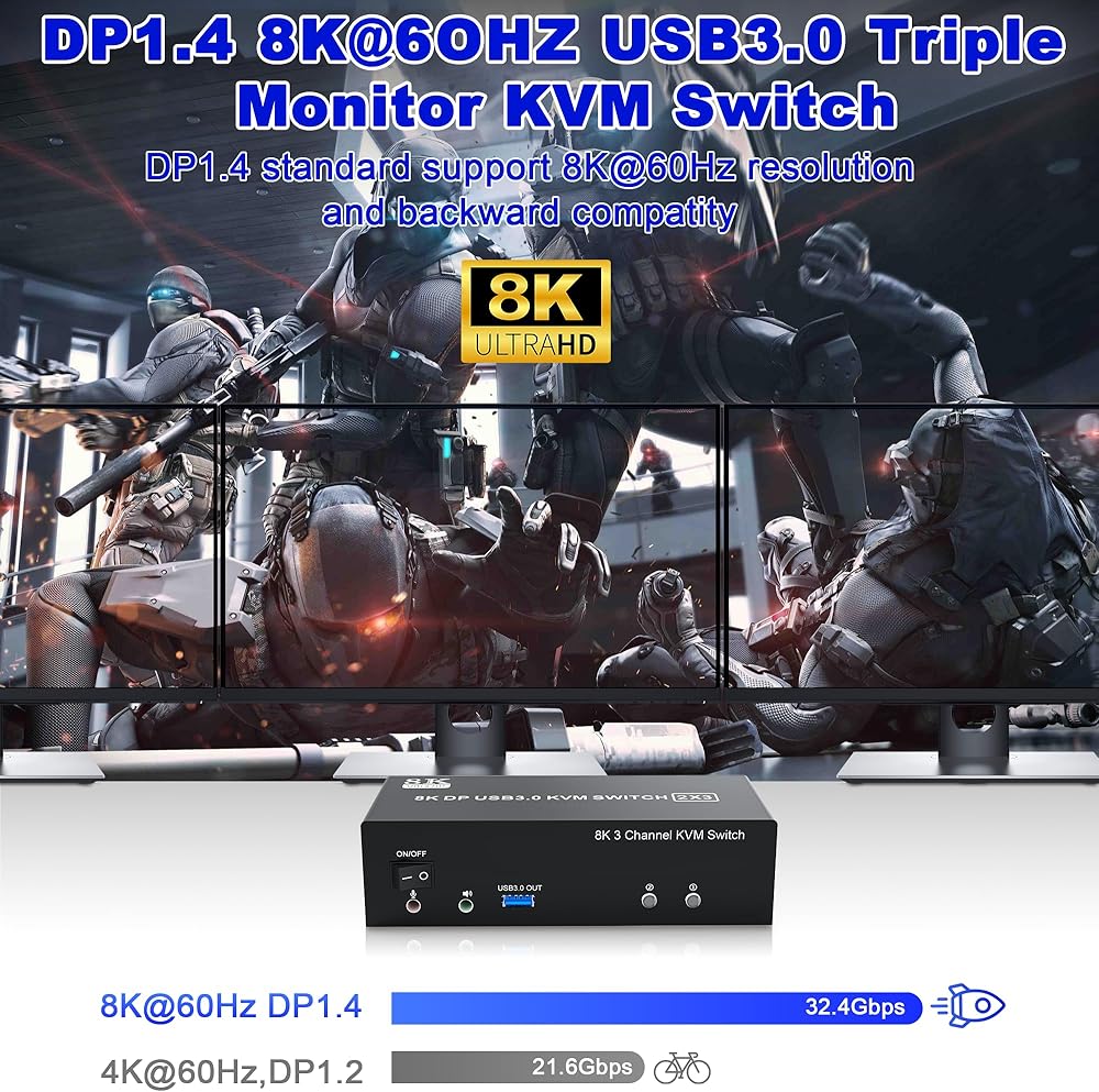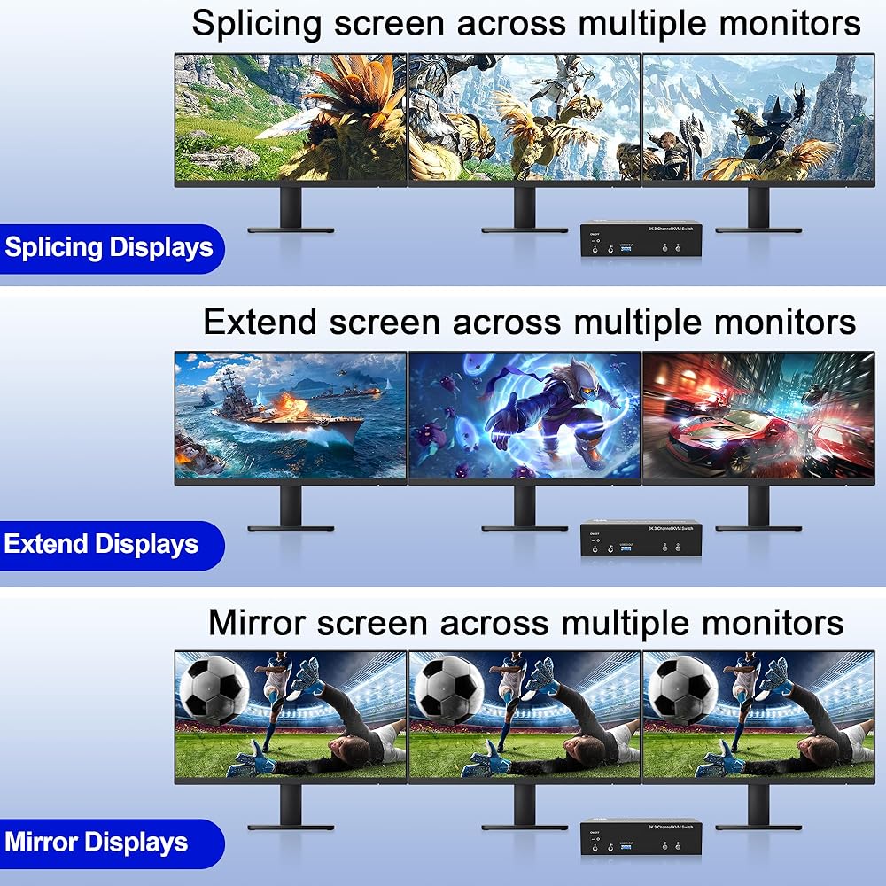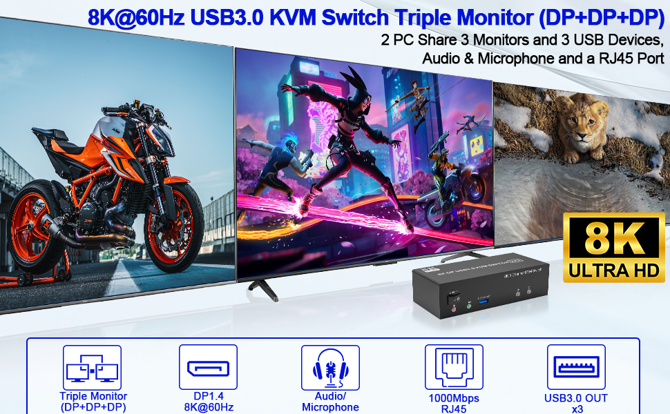 شاشة KVM Switch الثلاثية فائقة الدقة 8K@60هرتز: 3 شاشات KVM Switch DisplayPort: يدعم دقة تصل إلى 8K@60هرتز/4K@144هرتز، ومتوافق مع الإصدارات السابقة بدقة أقل. ملحوظة: لا يمكنك الحصول على 8K إلا إذا كانت بطاقة الرسومات والشاشة بجهاز الكمبيوتر الخاص بك تدعمان 8K.
