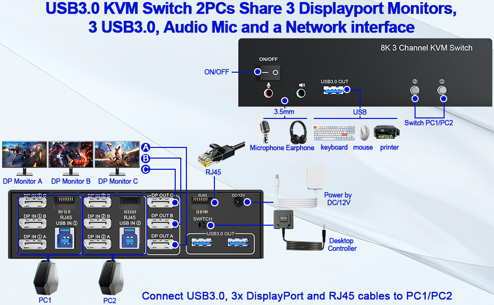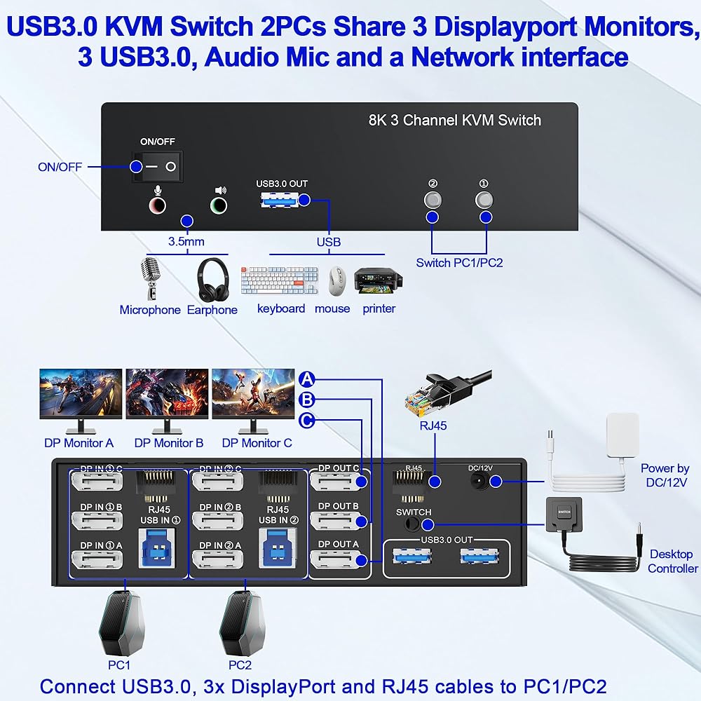 KVM Switch 3 شاشات 2 جهاز كمبيوتر: يسمح مفتاح KVM لجهازي كمبيوتر بمشاركة 3 شاشات Displayport، وموزع RJ45 Ethernet، و3 منافذ USB 3.0، ومخرج الصوت والميكروفون. تحتاج فقط إلى مجموعة واحدة من لوحة المفاتيح والماوس للتحكم في جميع الشاشات، وهي تدعم وضع العرض والتوسيع والمرآة. وضع الربط: يقوم مضيف الكمبيوتر بإخراج شاشات الربط على 3 شاشات. الوضع الممتد: يقوم مضيف الكمبيوتر الشخصي بإخراج 3 صور مختلفة على 3 شاشات. وضع النسخ: يقوم مضيف الكمبيوتر بإخراج 3 صور متطابقة على 3 شاشات. (ملاحظة: يرجى التأكد من أن جهاز الكمبيوتر الخاص بك يدعم شاشات العرض المتعددة وأن كل كمبيوتر متصل يتطلب 3 منافذ DP)