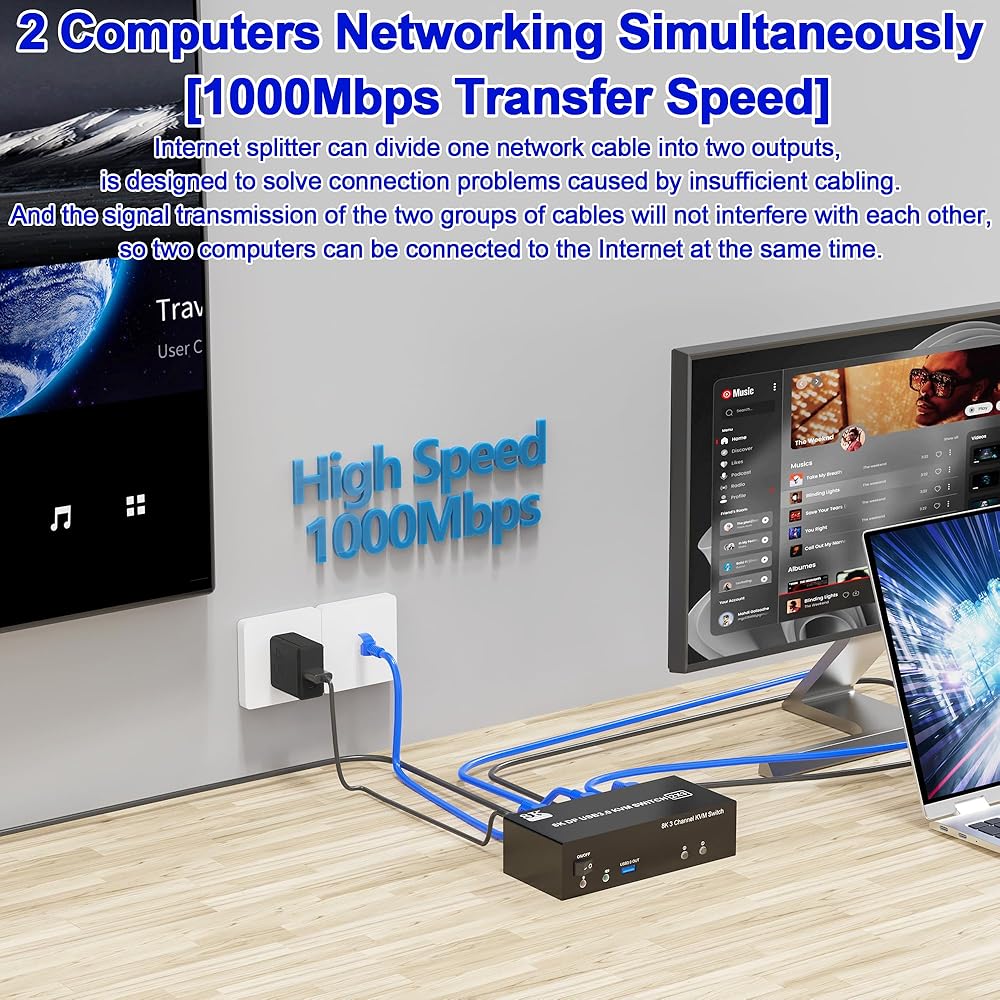 KVM Switch Triple Monitor RJ45 Ethernet Splitter 1 إلى 2: يمكن لمفتاح RJ45 Ethernet Splitter KVM هذا تقسيم كابل شبكة واحد إلى مخرجين. يمكن توصيل جهازي كمبيوتر بالإنترنت في نفس الوقت. يدعم أداء جيجابت إيثرنت بسرعة 1000 ميجابت في الثانية. يتوافق موسع موصل موزع إيثرنت RJ45 مع كابل إيثرنت شبكة Cat67 Cat6 Cat5 Cat5e.