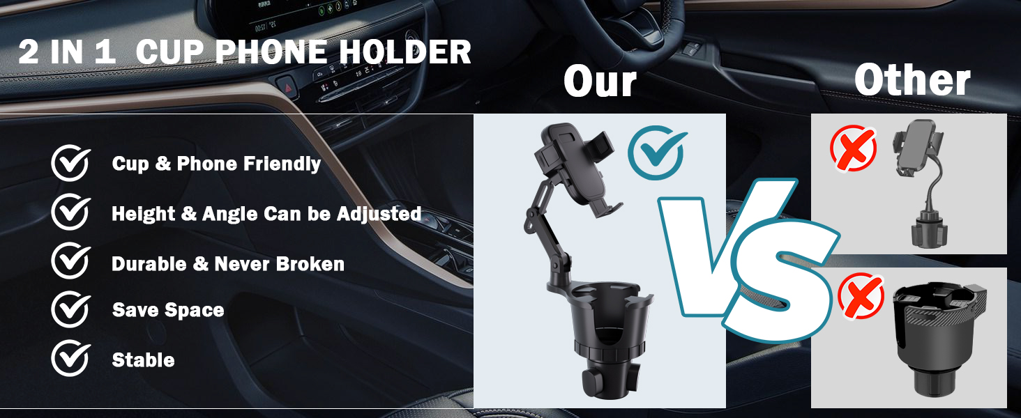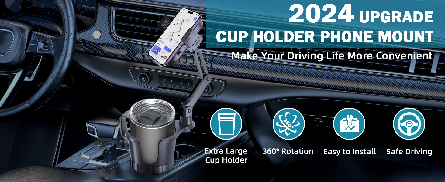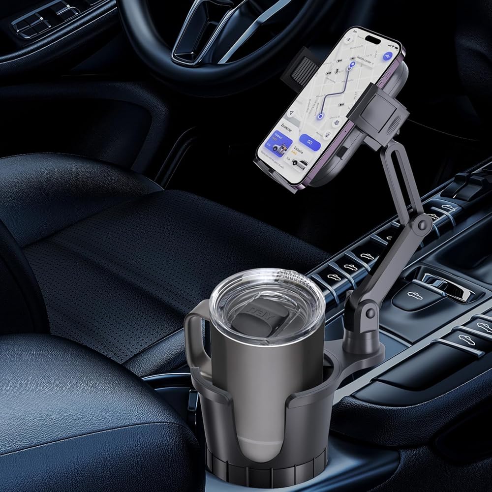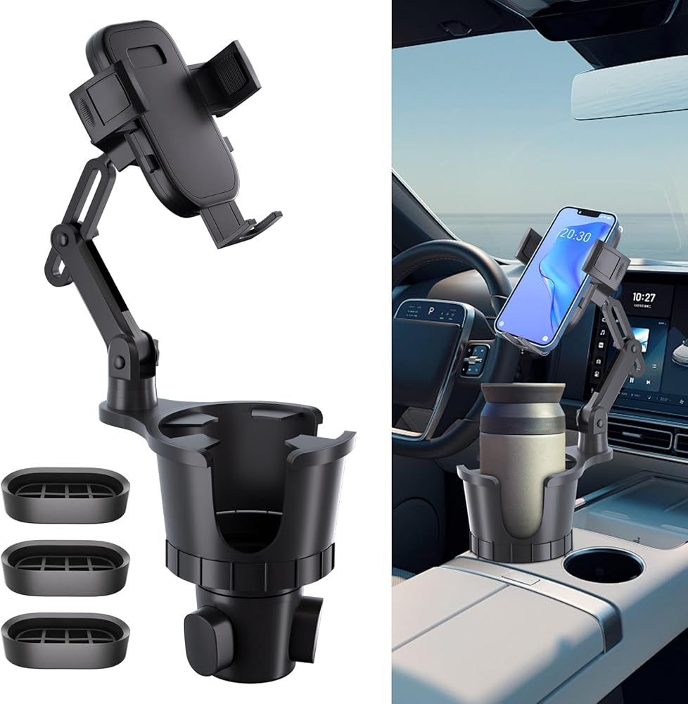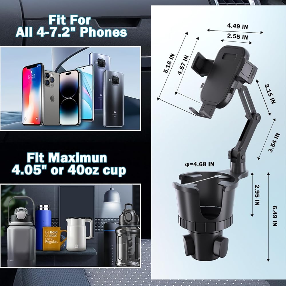 حامل أكواب للهاتف - موسع حامل أكواب السيارة 2 في 1 مع قاعدة طويلة قابلة للتعديل وقاعدة قابلة للدوران 360 درجة لهواتف iPhone وAndroid وجميع الهواتف الذكية