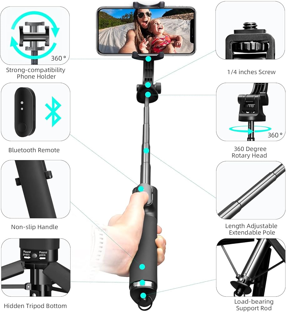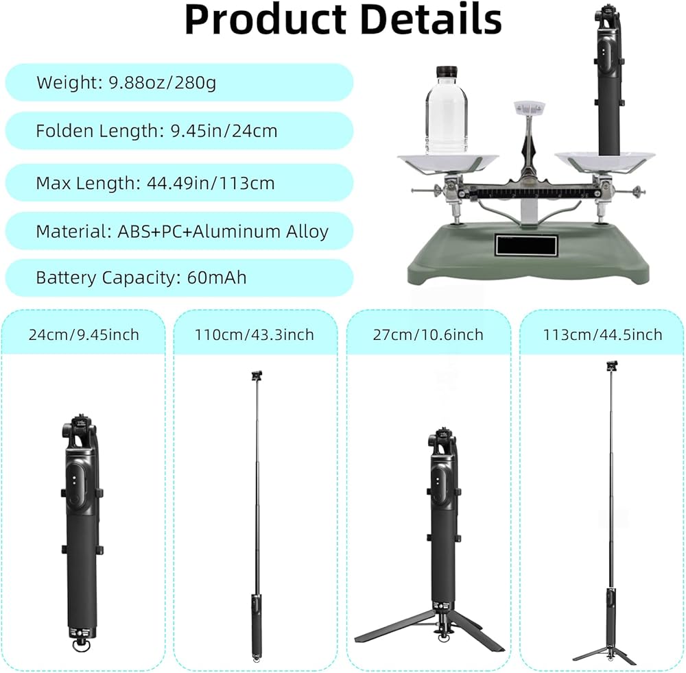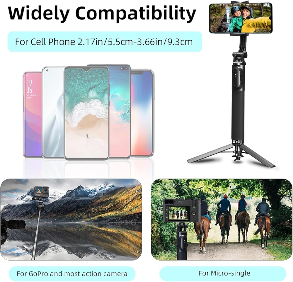 🏞[حامل ثلاثي عصا سيلفي 44.5 بوصة]: يمكن تمديد عصا السيلفي هذه من 9.45 بوصة/24 سم إلى 44.5 بوصة/113 سم، ويمكن تعديلها حسب الطول الذي ترغب في التقاط الصور أو مقاطع الفيديو.