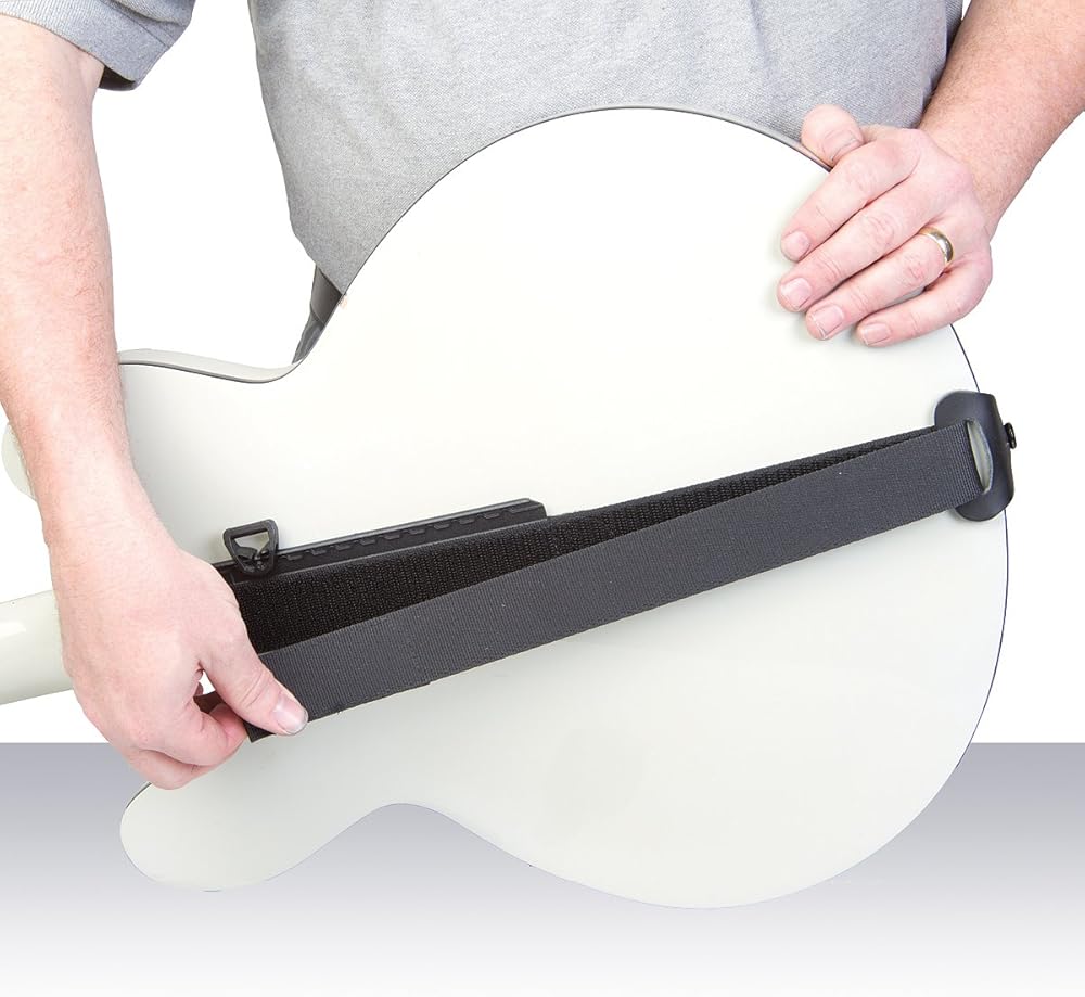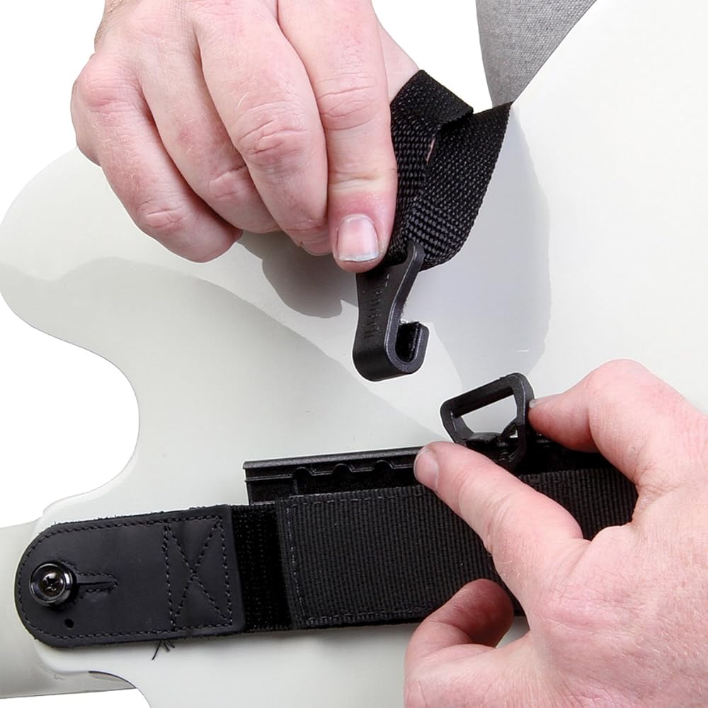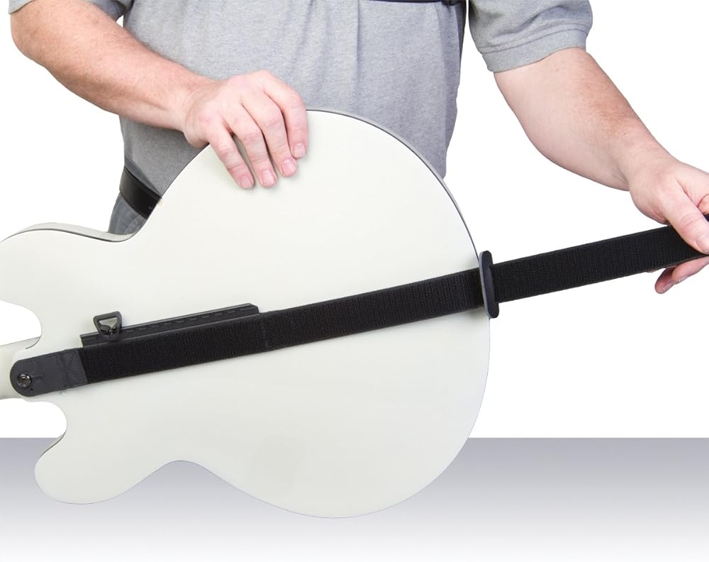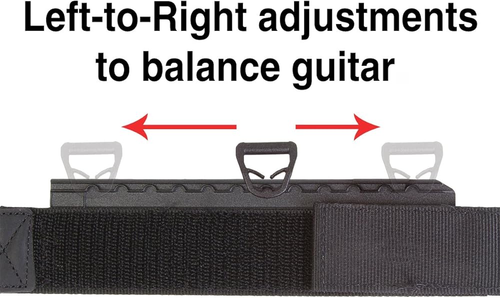 The Guitar support Back strap allows you to add a back strap to an additional guitar or bass, giving you the freedom to quickly switch between instruments. The non-marring guitar support Back strap attaches to the instrument's strap pins and offers 12 side-to-side adjustment positions so that you can find the perfect balance point of your instrument. Once achieved, simply hook the harness (sold separately) to the back strap. When finished playing, unhook the harness from the back strap. The guitar support Back strap can be left on the instrument as it fits easily in your case. This revolutionary system really enhances your comfort level while playing for long sessions.