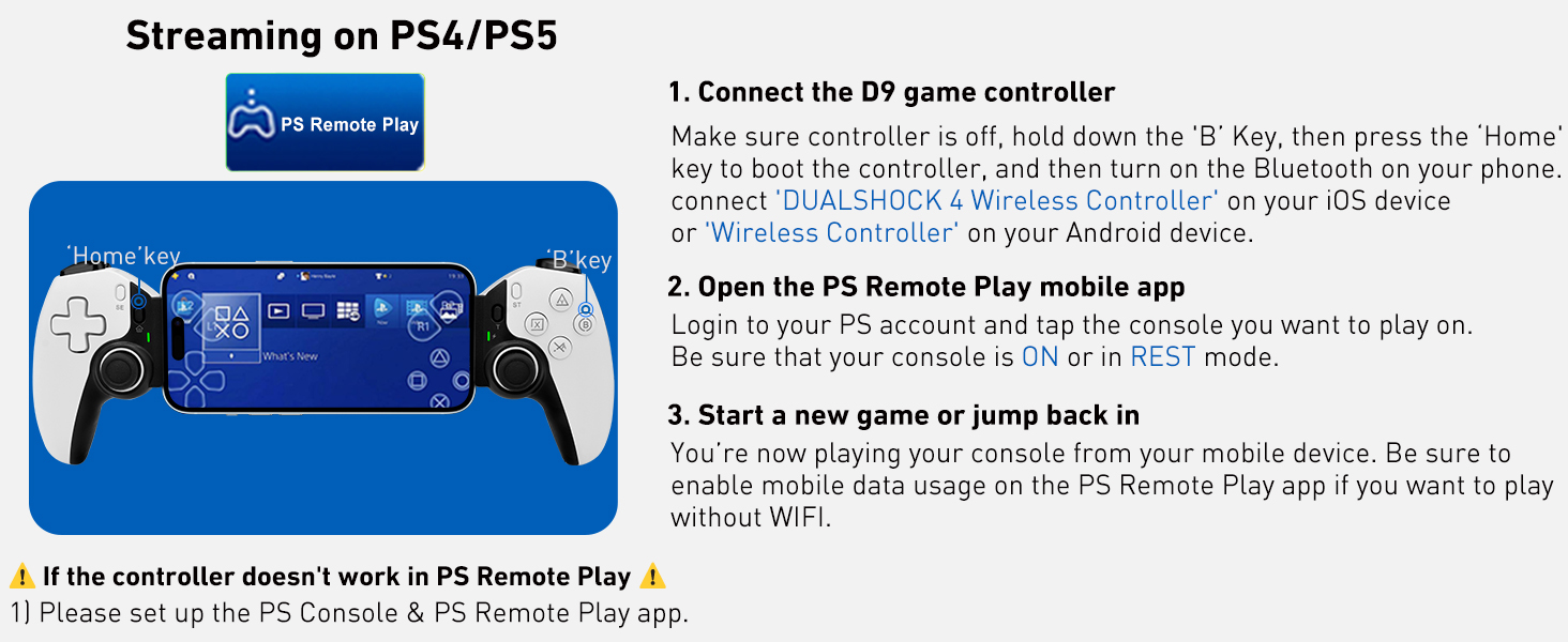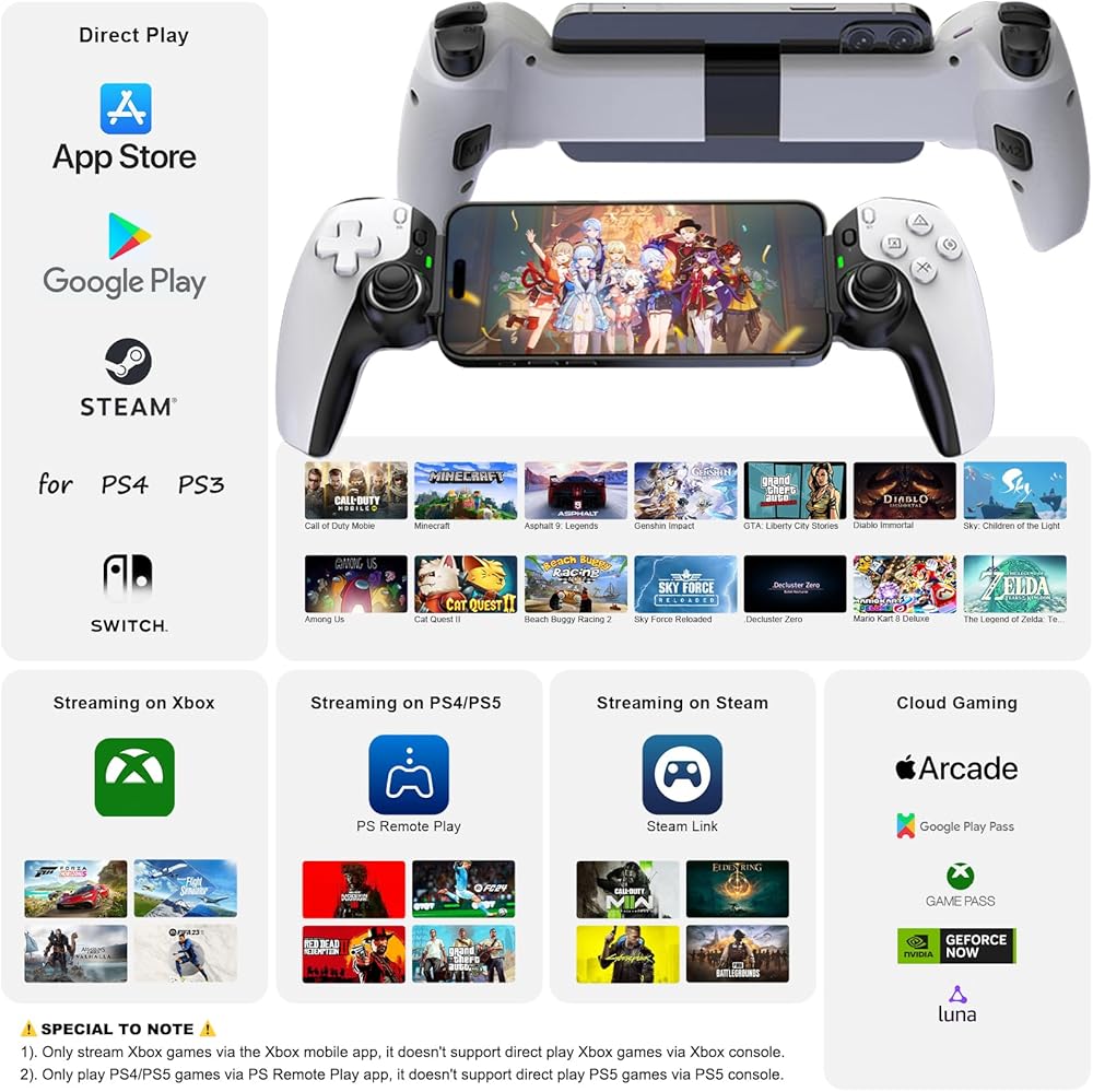 📱🎮حوّل هاتفك إلى وحدة تحكم للألعاب: تدعم وحدة التحكم المحمولة Megadream البث على أجهزة PS5/PS4 وXbox Series/Xbox One ووحدة تحكم الكمبيوتر الشخصي. باستخدام تطبيق PS Remote Play/ Xbox/ Steam Link، يمكنك تشغيل الألعاب المثبتة على وحدة التحكم الخاصة بك من هاتفك. طالما أن وحدة التحكم الخاصة بك متصلة بالطاقة والإنترنت ويتم تشغيلها، يمكنك بدء ألعاب جديدة أو العودة مرة أخرى من أي مكان في العالم تقريبًا.