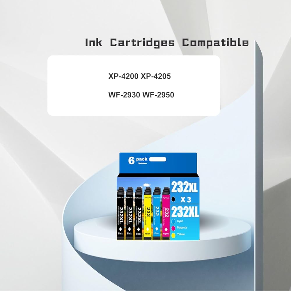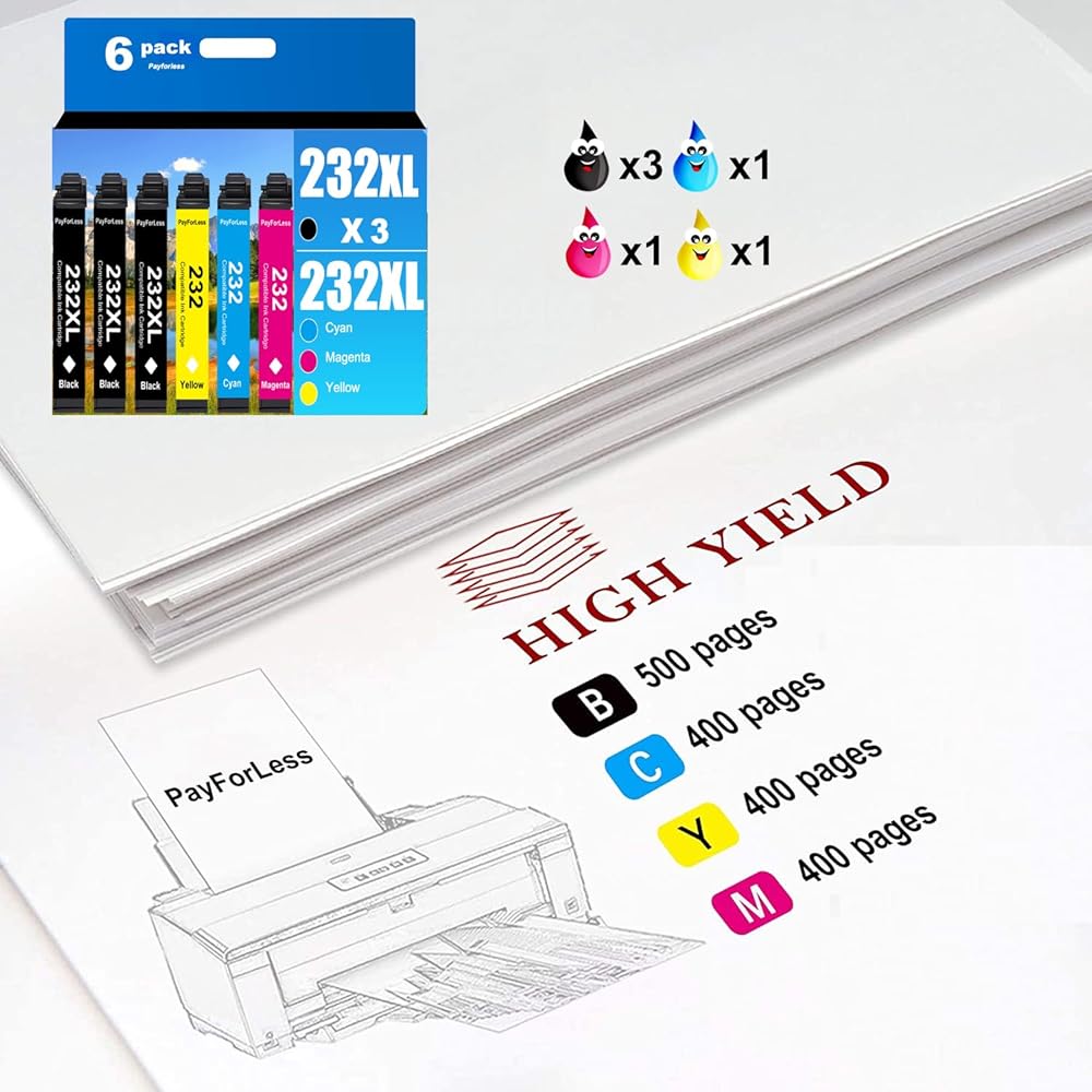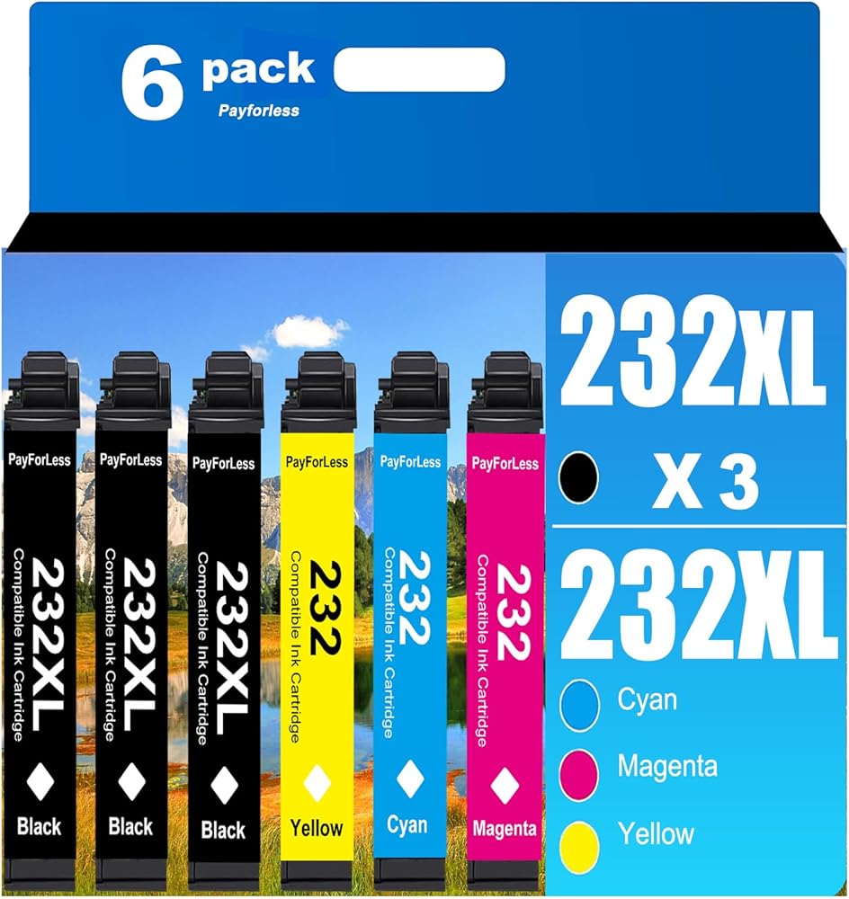 تحتوي العبوة على: 6 خراطيش حبر مقاس 232XL. 3 × أسود، 1 × سماوي، 1 × أرجواني، 1 × أصفر.