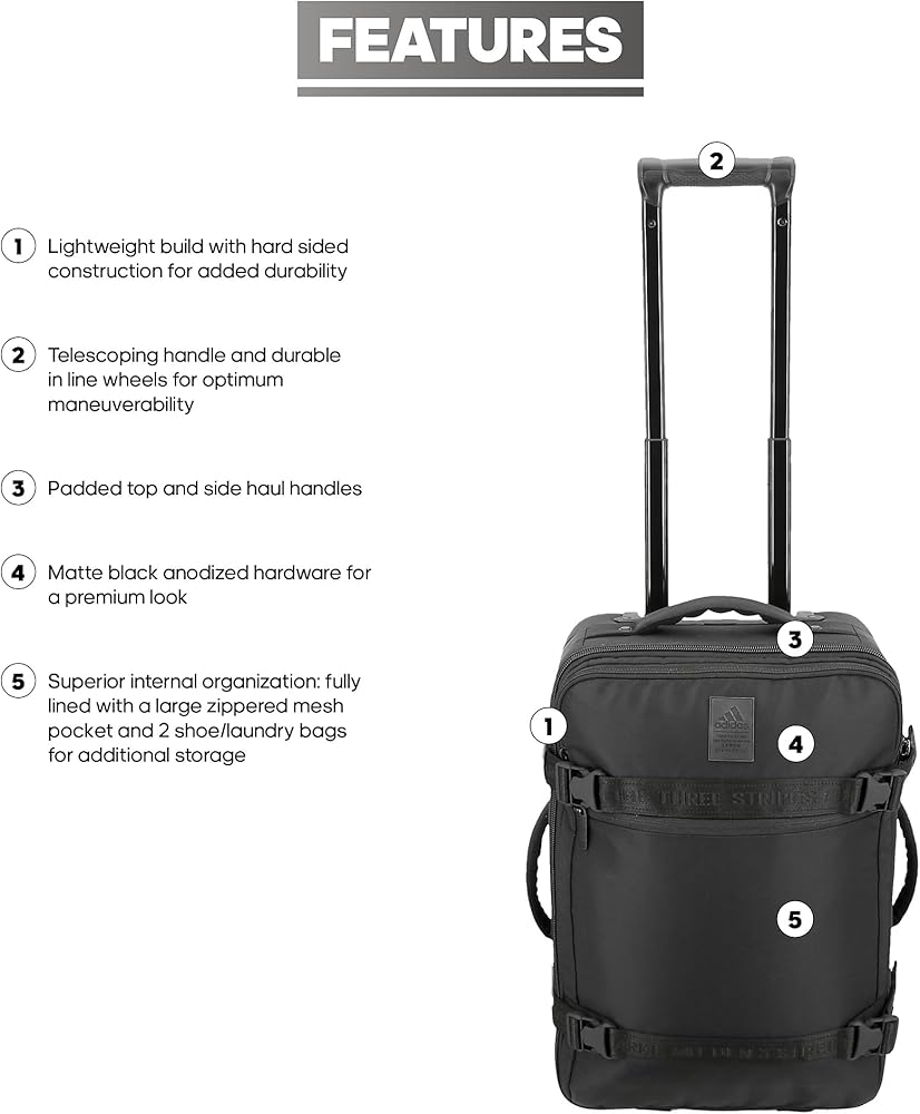 بناء خفيف الوزن مع هيكل صلب من الجانب لمزيد من المتانة. مقبض تلسكوبي وعجلات متينة من أجل أفضل قدرة على المناورة. مقابض سحب علوية وجانبية مبطنة. أجزاء صلبة مطلية بطبقة أكسدة سوداء مطفأة اللمعة لمظهر فاخر. تنظيم داخلي فائق: مبطن بالكامل بجيب شبكي كبير بسحاب و2 كيس للحذاء/الغسيل لمزيد من التخزين.