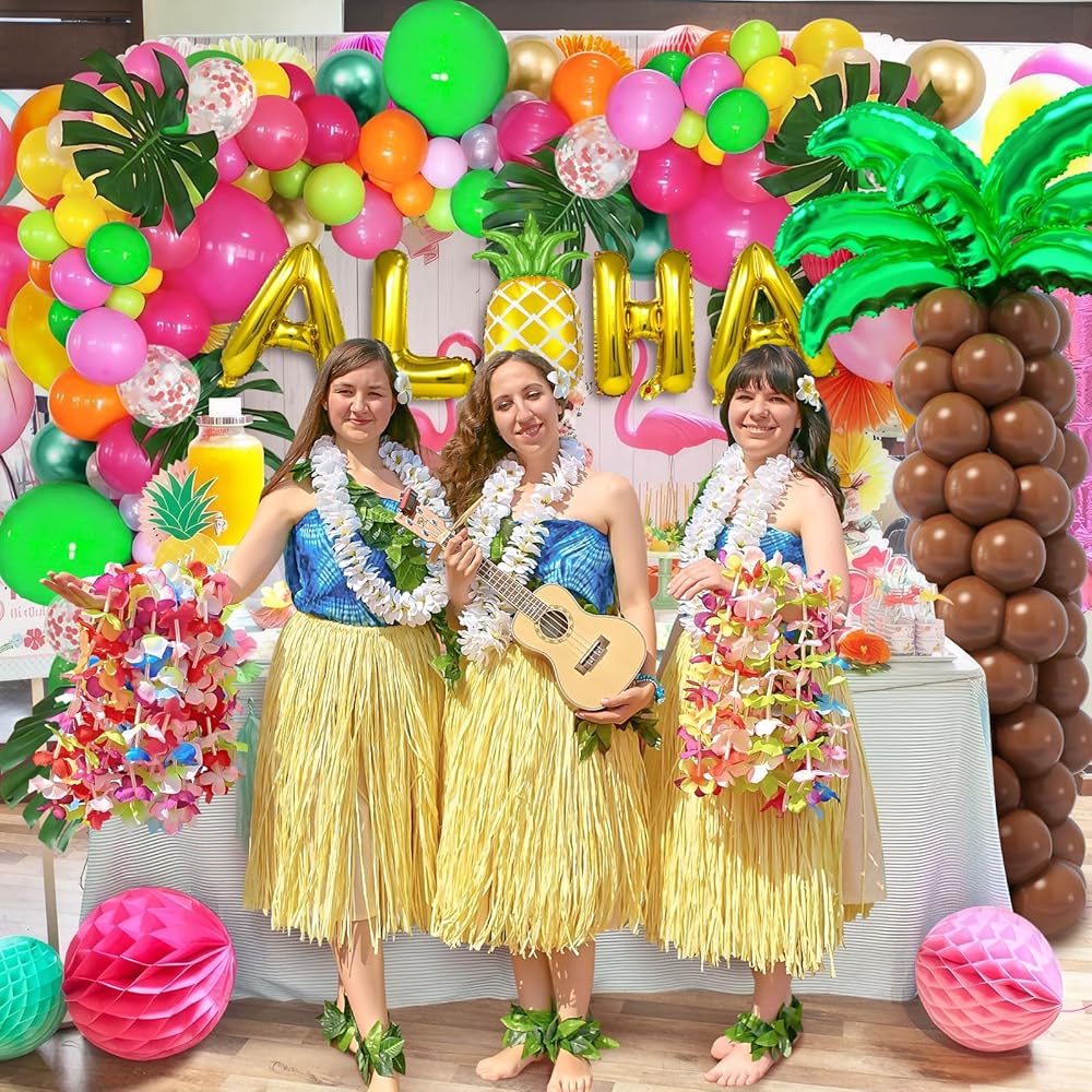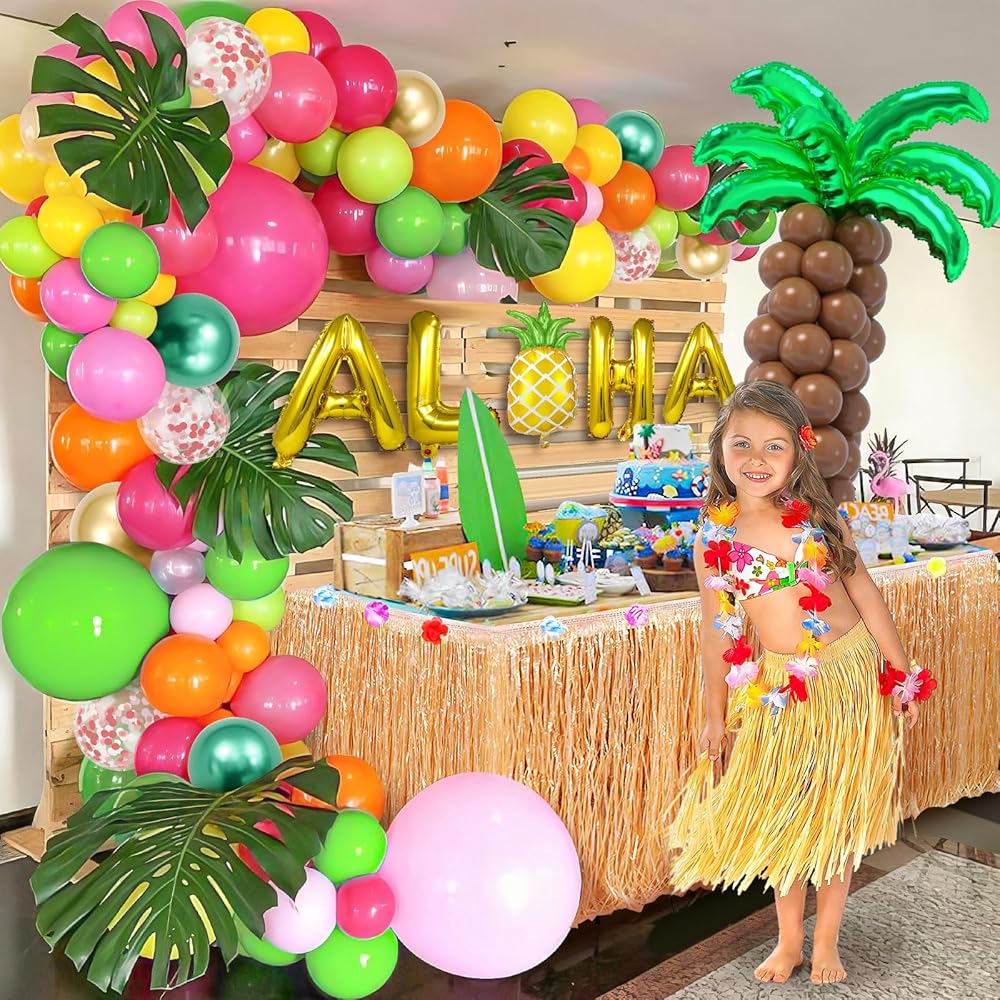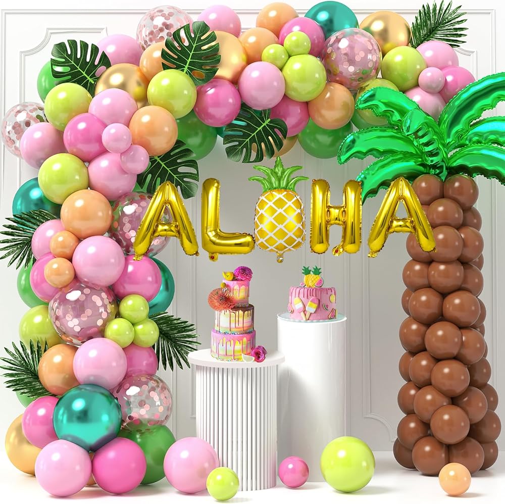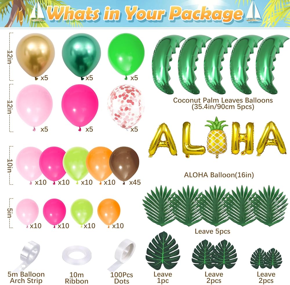 178 قطعة من بالونات لواو الاستوائية مجموعة إكليل قوس زينة حفلات هاواي مع بالونات ألوها الأناناس من رقائق جوز الهند وأوراق النخيل، لوازم تزيين حفلات أعياد الميلاد للأطفال في الصيف على الشاطئ