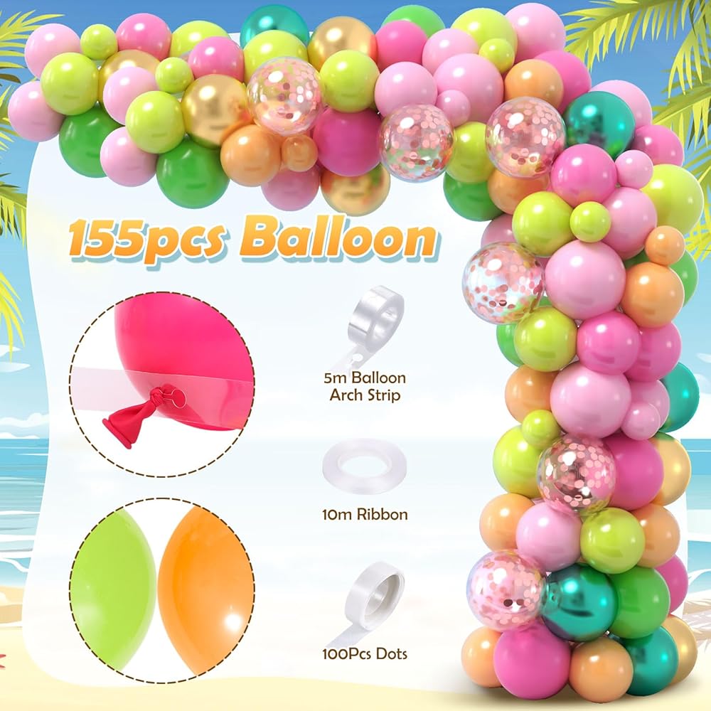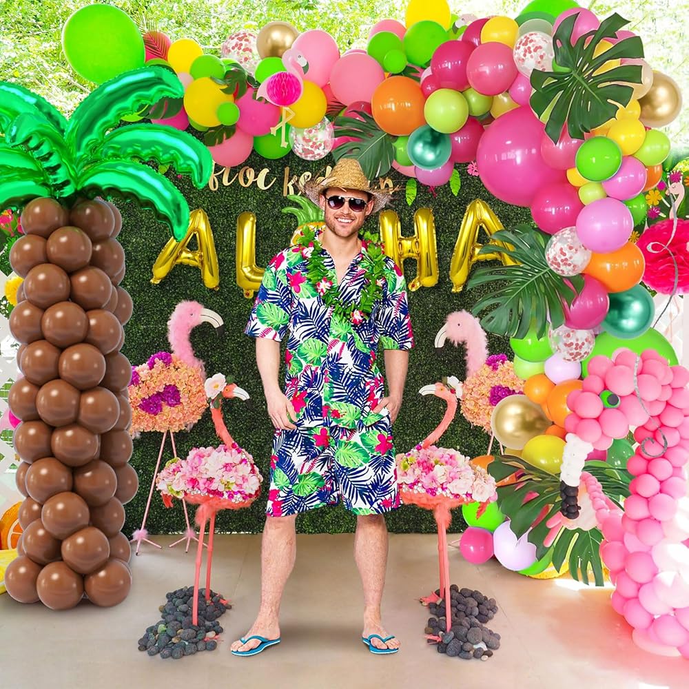 مجموعة قوس البالونات الاستوائية المكونة من 178 قطعة - تتضمن مجموعة قوس البالونات الاستوائية المكونة من 178 قطعة كل ما تحتاجه لإنشاء حفلة مذهلة بطابع هاواي. مع 155 بالونة لاتكس، بالونات رقائق ألوها (تحتوي على أناناس بدلاً من الحرف "O")، 5 بالونات من رقائق نخيل جوز الهند، 10 أوراق نخيل محاكاة، 100 نقطة صمغ، شريط 5 متر، وسلسلة بالونات بطول 5 متر، هذه المجموعة الوفيرة تسمح يمكنك تجربة متعة بناء شجرة البالونات وتضيف المتعة إلى أي احتفال لوا.